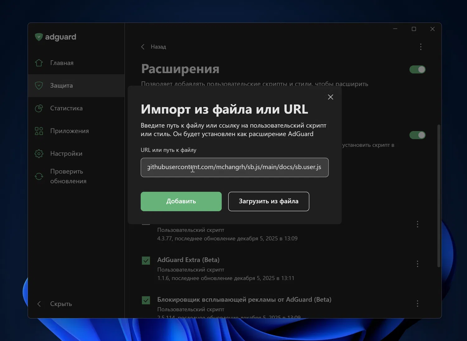 - В AdGuard перейдите в Расширения > Добавить расширение > Импорт из файла или URL.