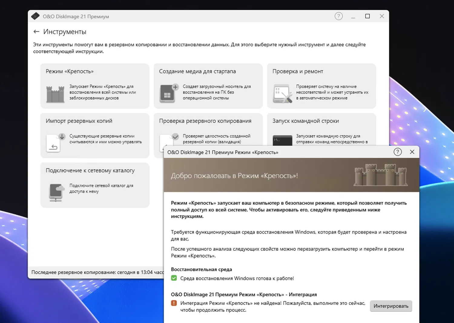 Уникальный Режим «Крепость» (Fortress Mode<) запускает DiskImage в изолированной среде Windows, что обеспечивает: