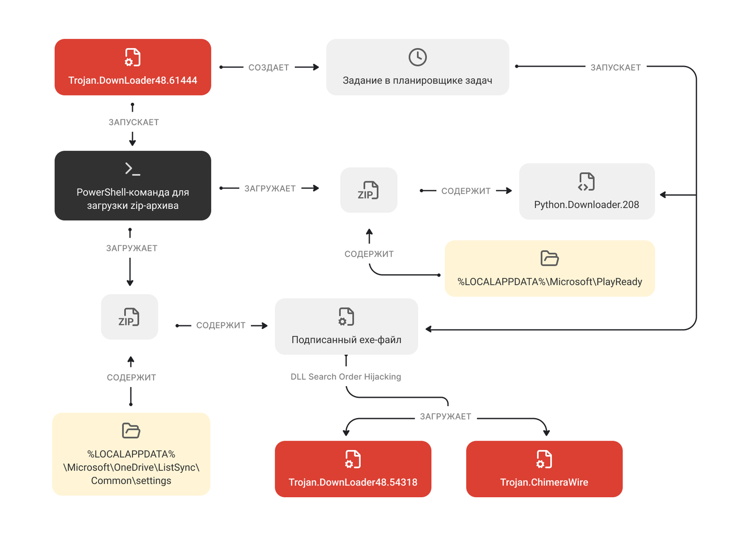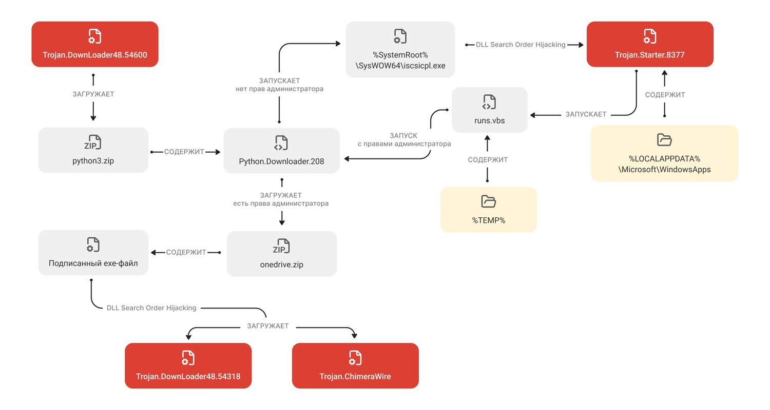 Сам Trojan.ChimeraWire — последняя стадия в довольно сложной цепочке заражения. Исследователи «Доктор Веб» описывают по меньшей мере две такие цепочки, в которых участвуют несколько загрузчиков, скриптов и DLL-библиотек.