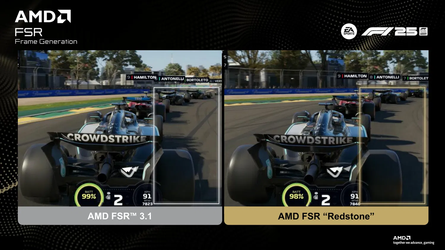 - Усовершенствованное ML-масштабирование изображения. Новый апскейлер обучен на большом наборе высококачественных кадров и способен восстанавливать детали, которые традиционные алгоритмы апскейлинга обычно теряют. «Redstone» улучшает качество мелких текстур, геометрии на дальних дистанциях и снижает артефакты, характерные для FSR 2.x.