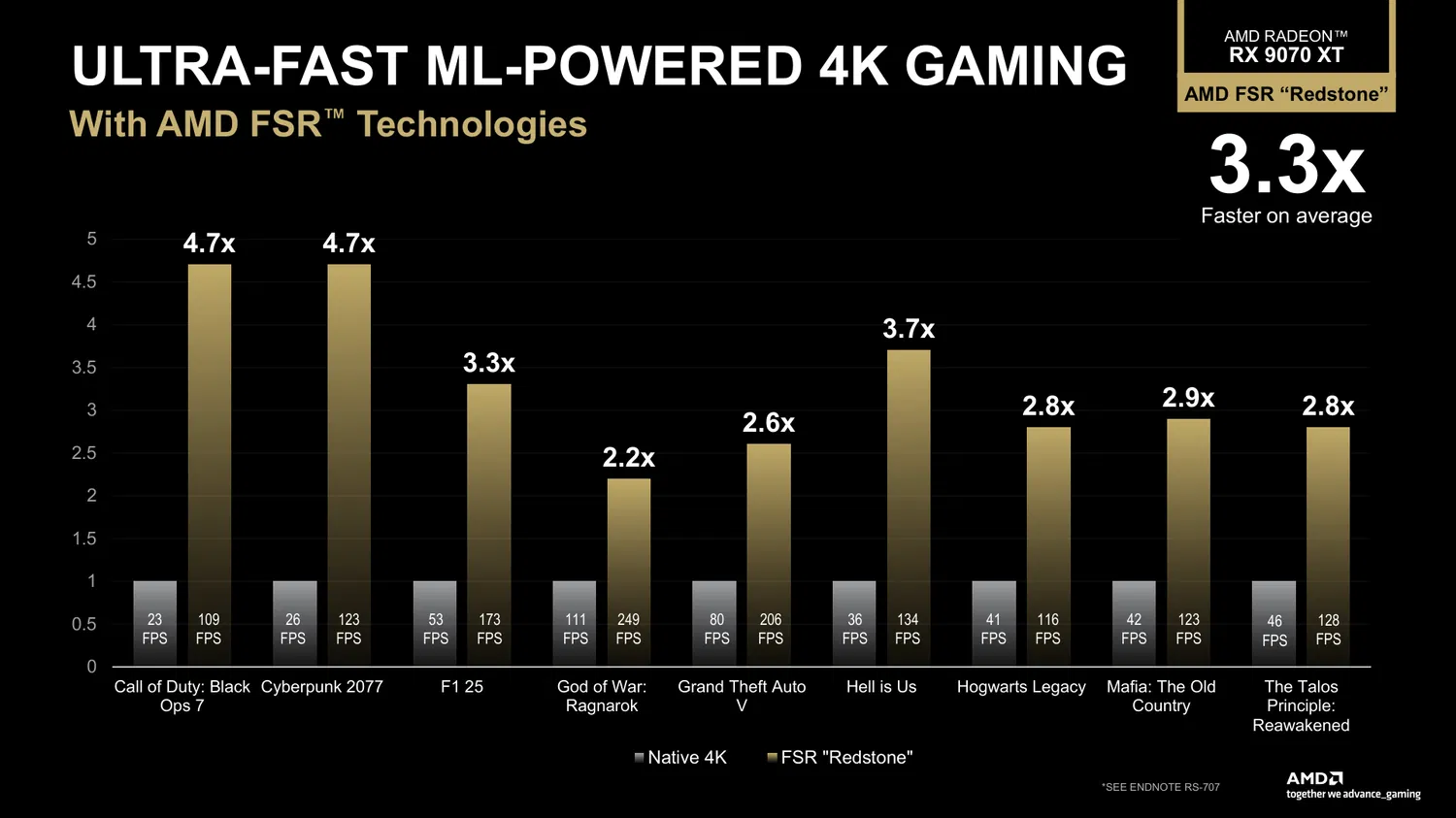 AMD также представила графики, демонстрирующие, какого уровня ускорения могут ожидать пользователи благодаря Redstone. По сравнению с нативным 4K в оптимальных условиях прирост может достигать 370%. Даже в наименее благоприятных сценариях производительность должна увеличиться как минимум в два раза. Это касается и трассировки лучей.
