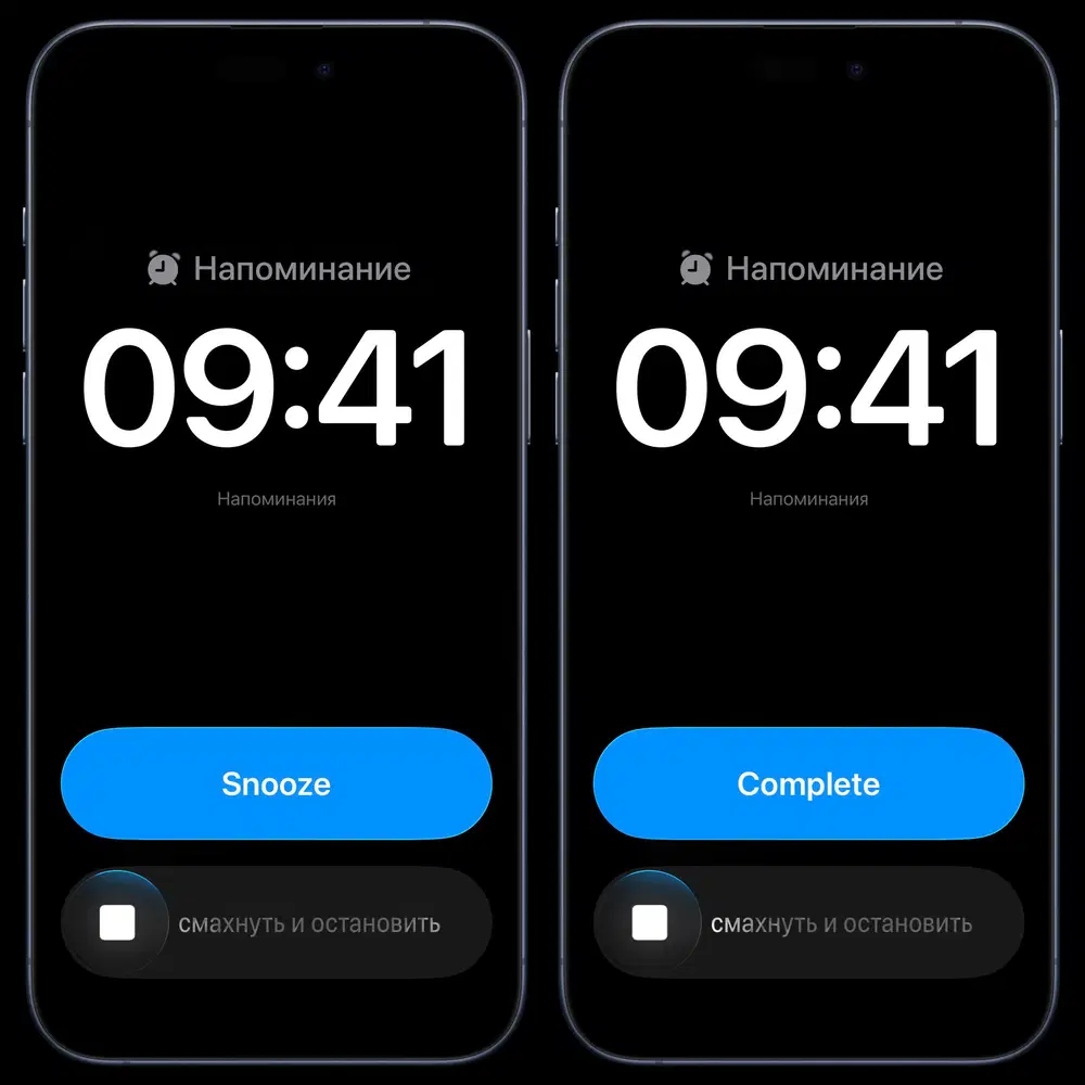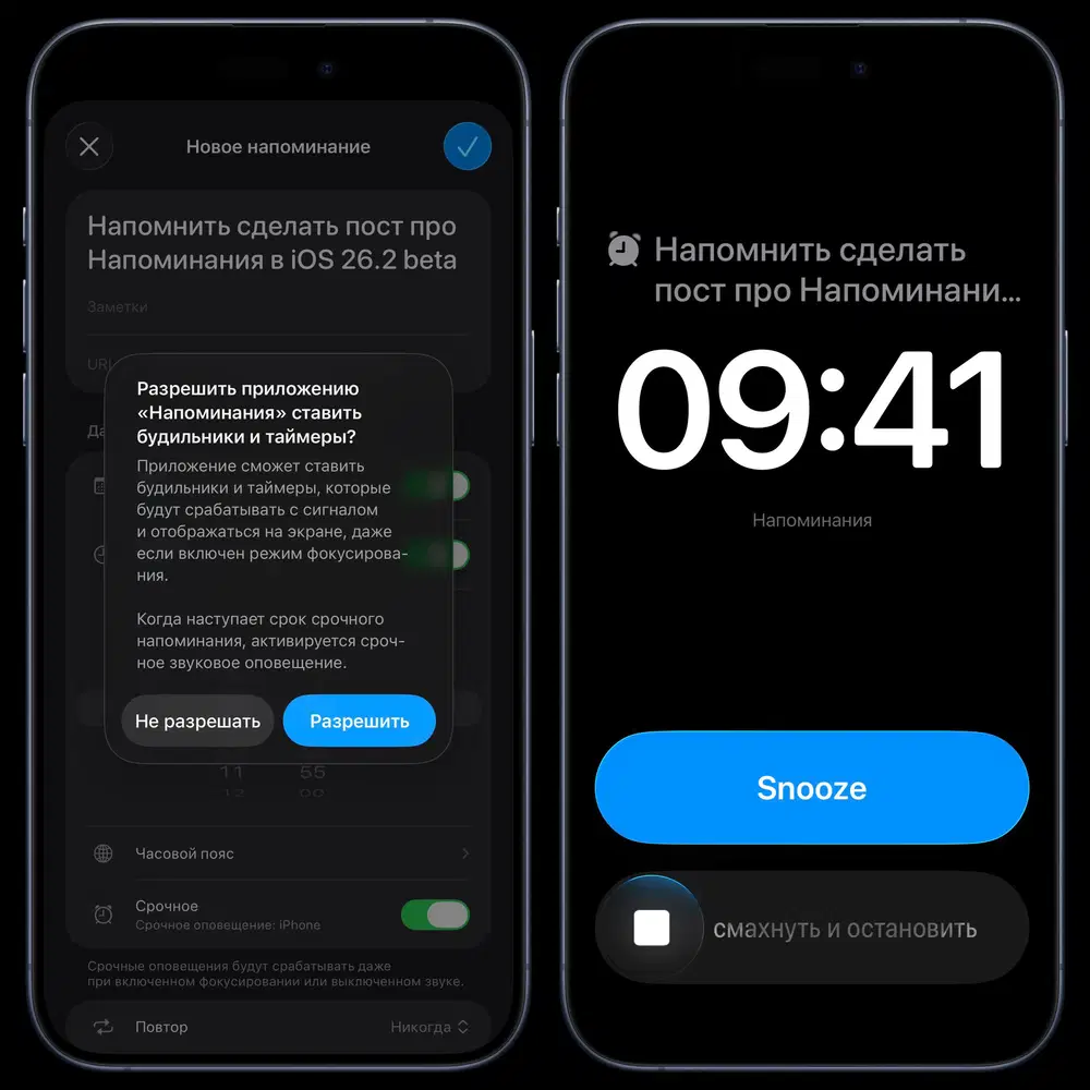 Приложение Напоминания теперь позволяет создавать срочные уведомления в виде будильников. Они срабатывают со звуком и отображаются на экране, даже если включён режим «Фокусирование». При нажатии кнопки «Отложить» запускается таймер, отображающий прошедшее время с момента активации уведомления — его можно видеть на экране блокировки и в Dynamic Island.
