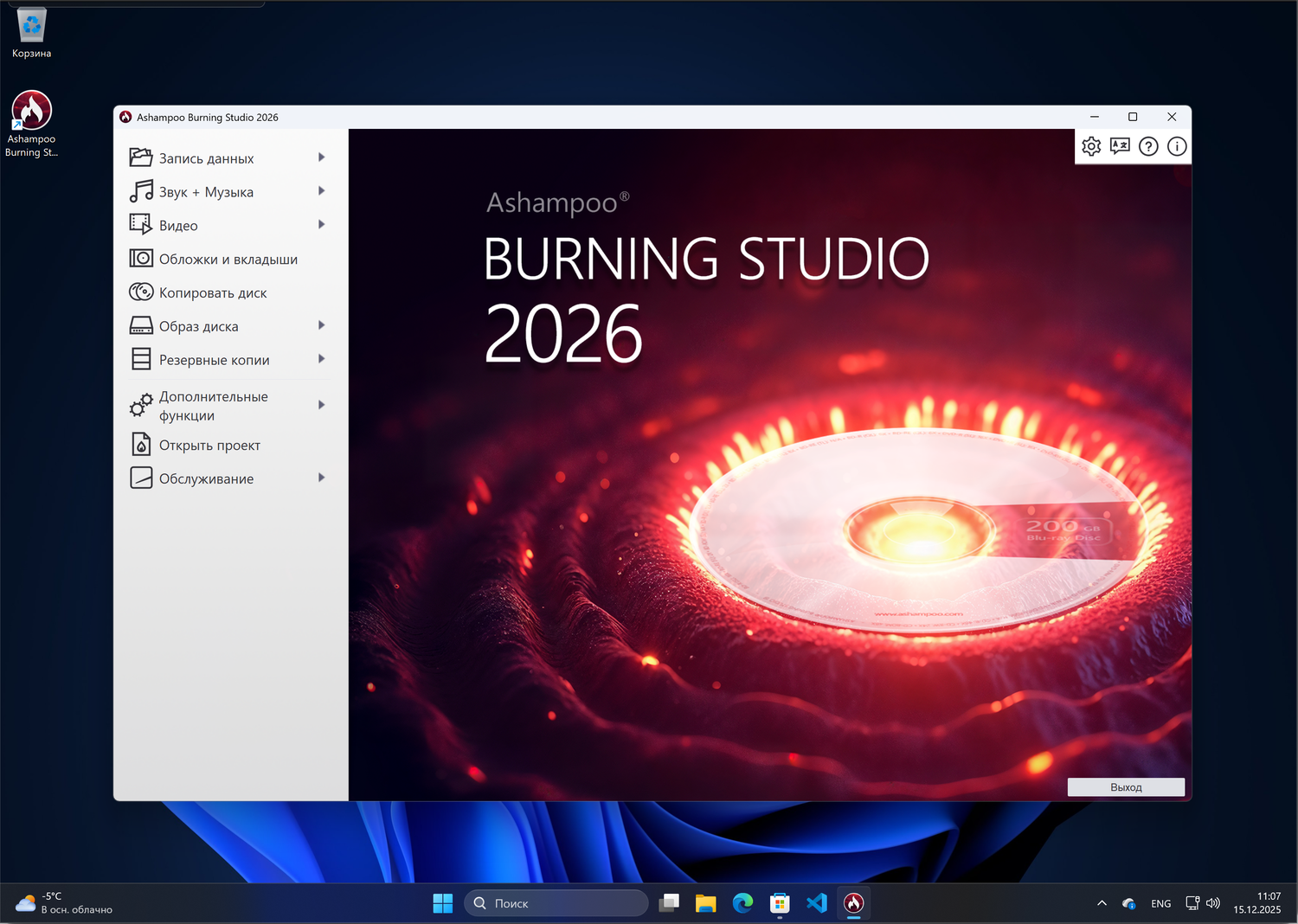 Ashampoo Burning Studio 2026 — это универсальная программа для записи CD, DVD и Blu-ray дисков, предназначенная как для повседневных задач, так и для более сложных сценариев работы с мультимедиа и резервным копированием данных. Приложение сочетает в себе стабильность, простоту использования и широкий набор функций, охватывающих практически все типы операций с оптическими носителями.