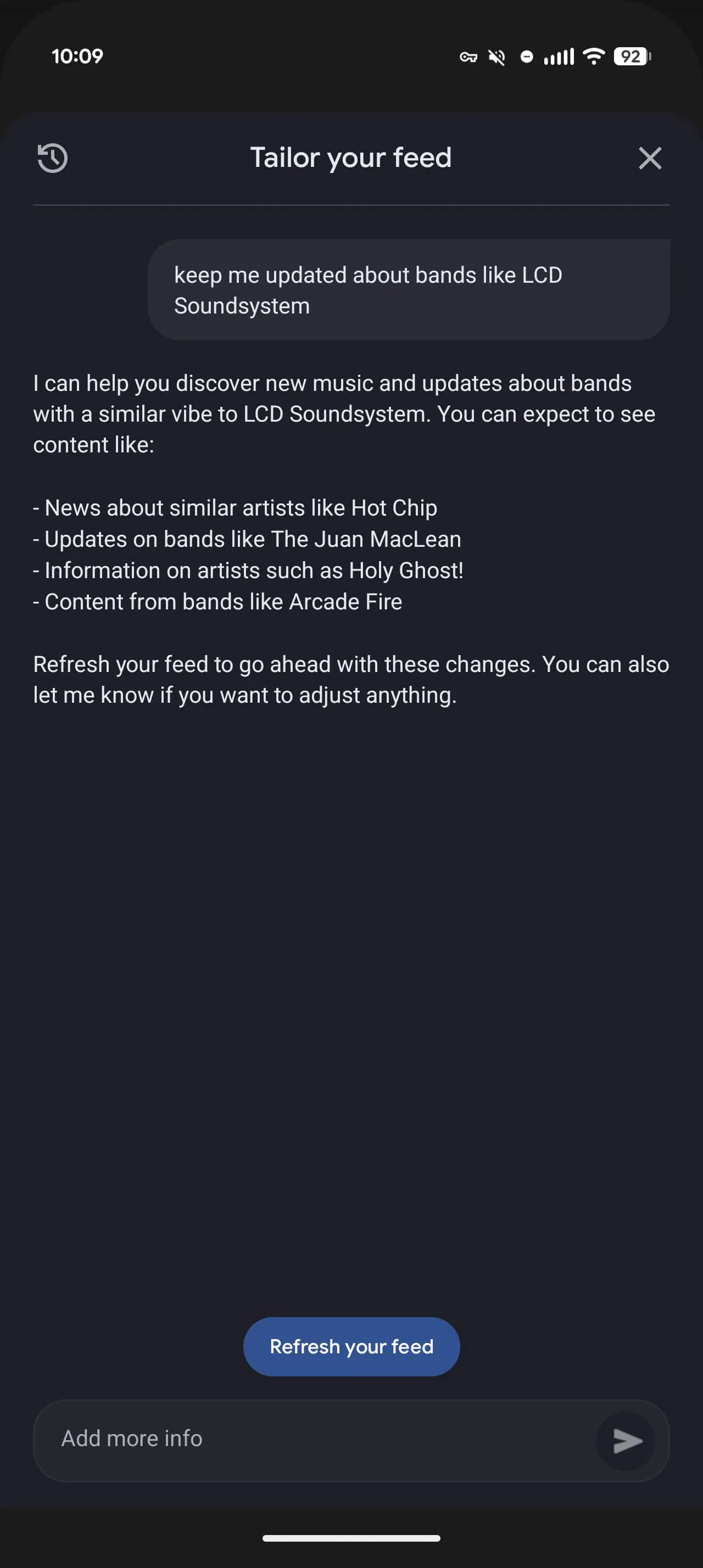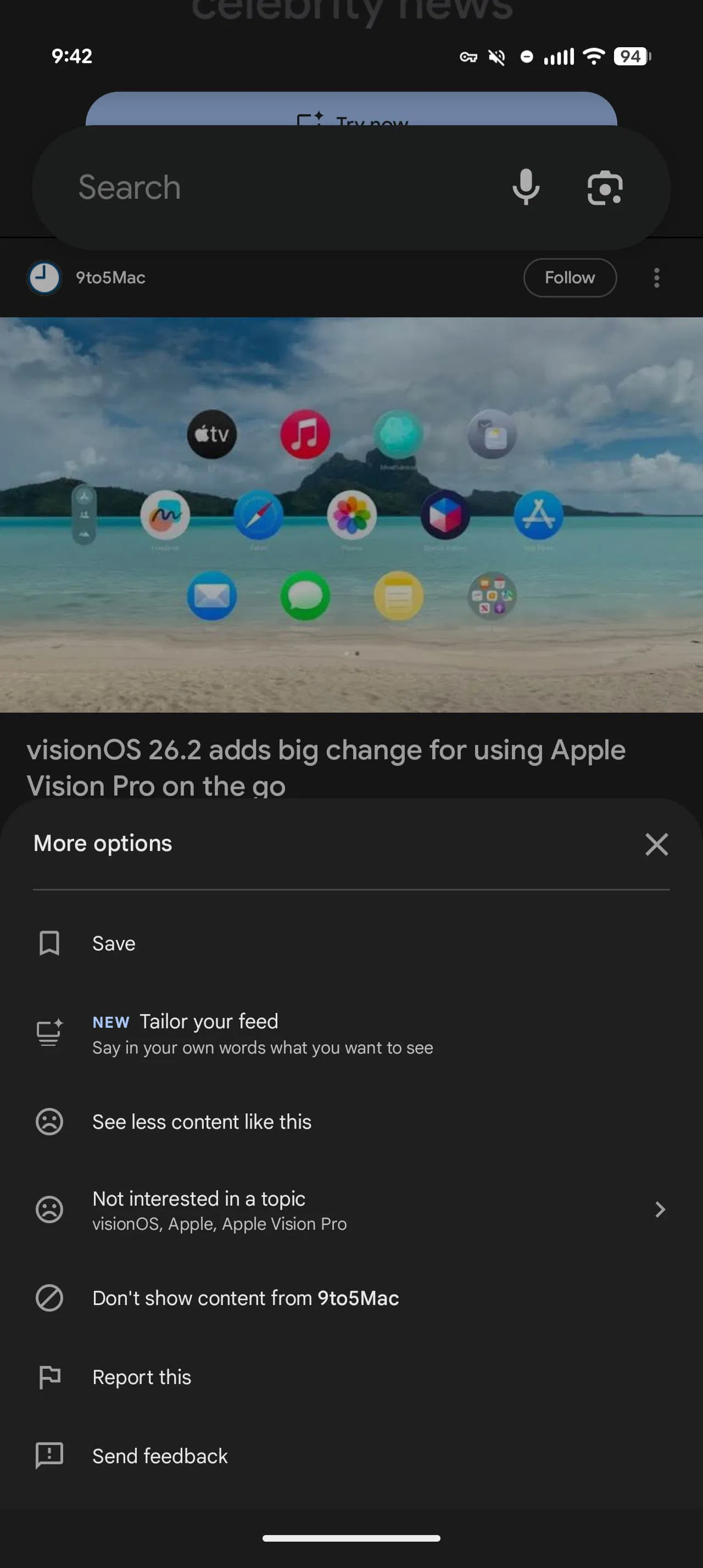На Android для доступа к функции нужно открыть приложение Google и нажать на иконку колбы Labs в левом верхнем углу. В списке экспериментов следует прокрутить вниз до пункта «Tailor your feed», включить переключатель и затем обновить ленты новостей свайпом вниз.