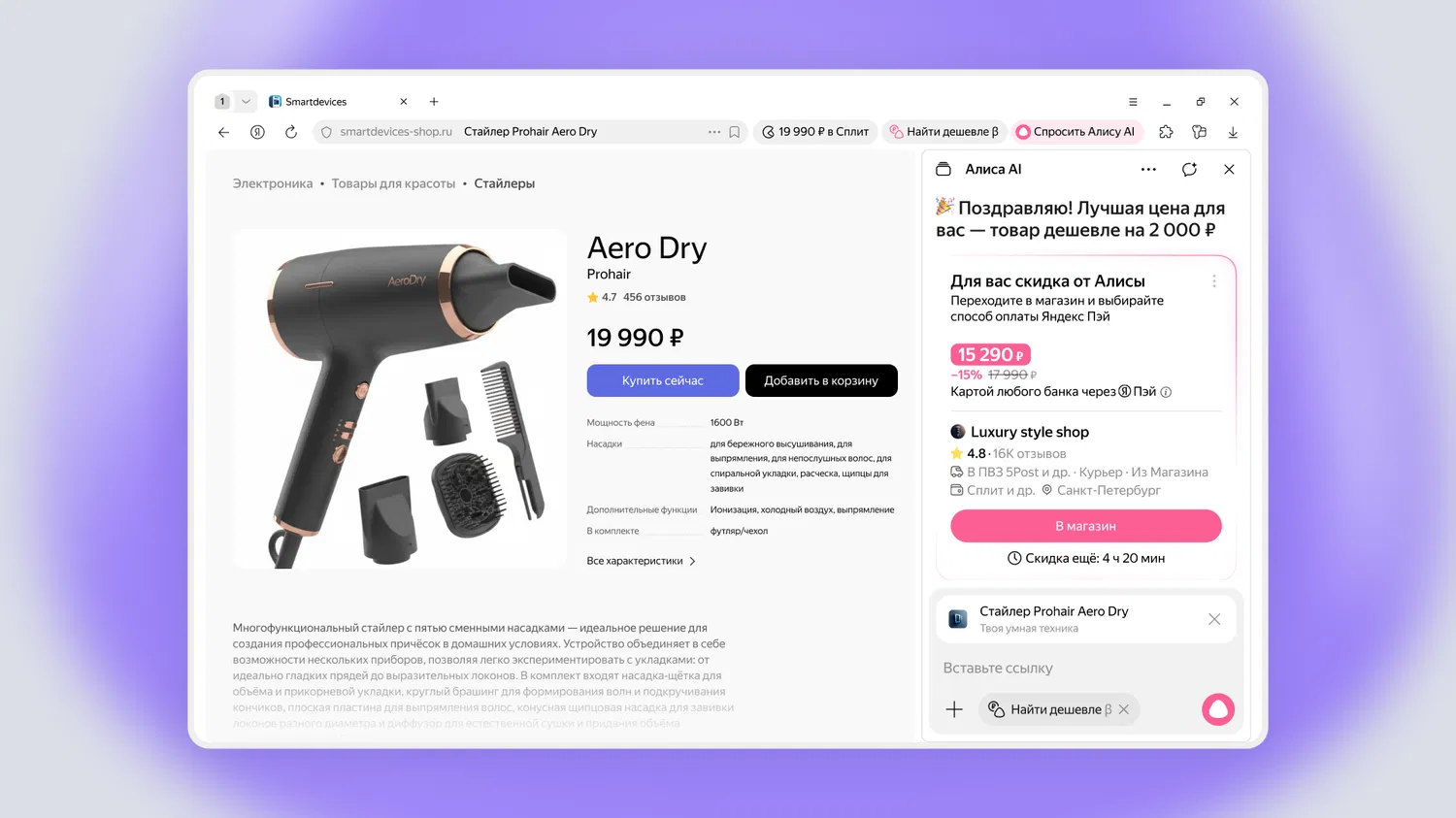 Где доступен агент: выбрать «Найти дешевле» можно в Алисе AI и в Яндекс Браузере, а в Поиске эта механика доступна через кнопку «Найти скидку».