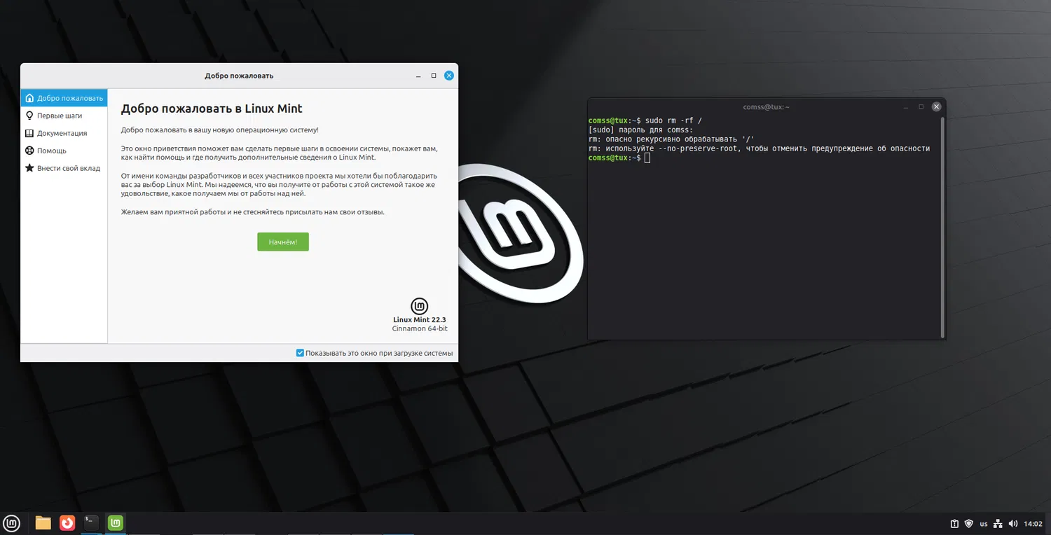 После активации команды с необходимым флагом процесс уничтожения данных был запущен. В отличие от старых версий систем, где рабочее окружение могло частично оставаться в оперативной памяти, современная установка Debian с оболочкой Xfce быстро пришла в негодность. Установка Linux Mint 22.3 частично продолжила работу в оперативной памяти. Ее настройки, меню запуска приложений были уничтожены.