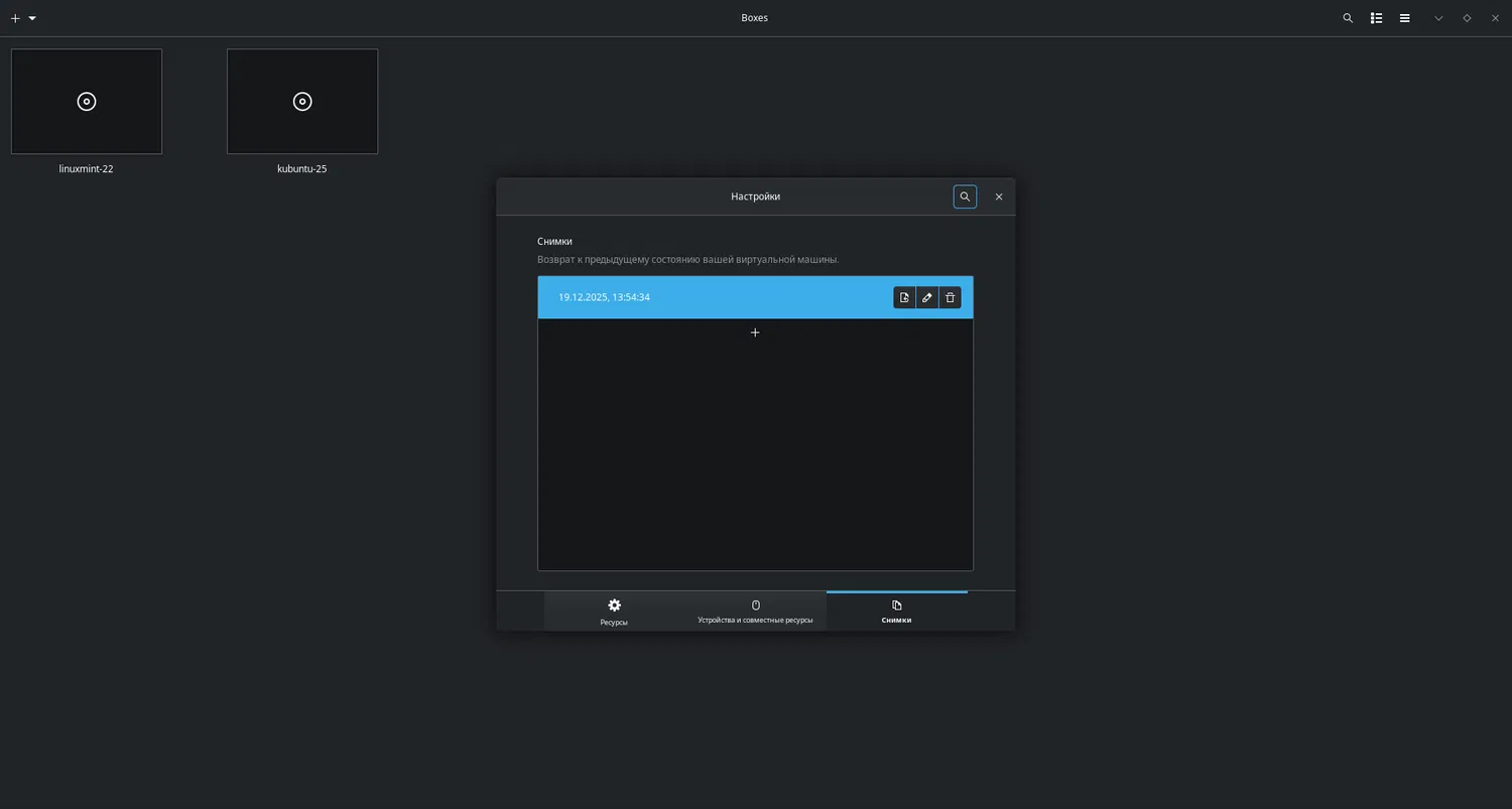 Наличие предварительно созданного снимка системы позволило вернуть виртуальную машину в рабочее состояние за несколько секунд. Функция восстановления в Gnome-Boxes успешно перезагрузила ОС до состояния, предшествующего запуску команды. Полученный результат подтверждает, что при наличии грамотной стратегии резервного копирования даже критические ошибки в терминале не становятся фатальными для рабочего процесса.