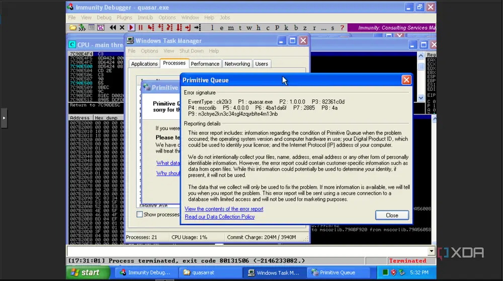 Инструмент удаленного администрирования Quasar RAT требует для работы .NET Framework версии не ниже 4.0. Несмотря на то что это последняя версия платформы, доступная для Windows XP, программа выдает критические ошибки. В ходе тестирования зафиксированы коды исключений 80131506 и clr20r3.