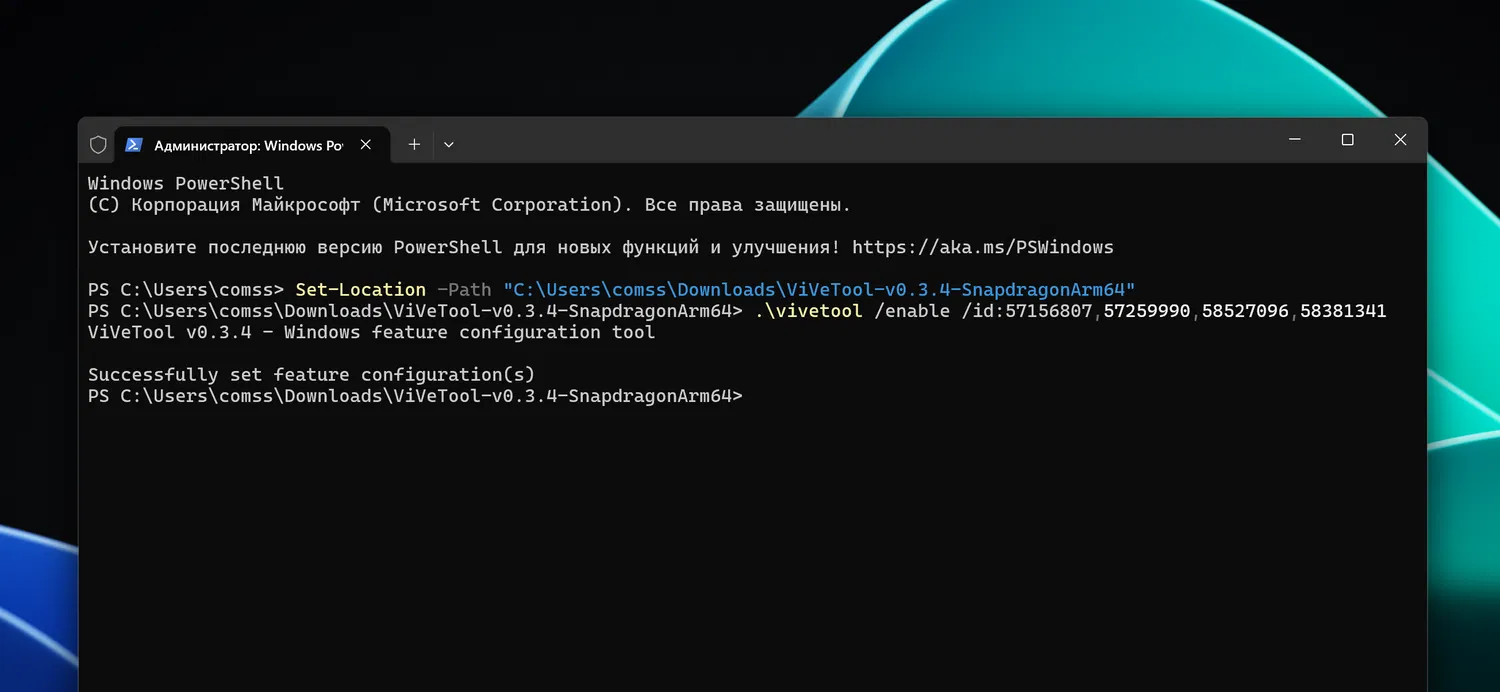 Примечание: В примерах выше используется Терминал Windows с профилем PowerShell. Если вы используете профиль Командная строка, замените начало команды .\vivetool на vivetool.
