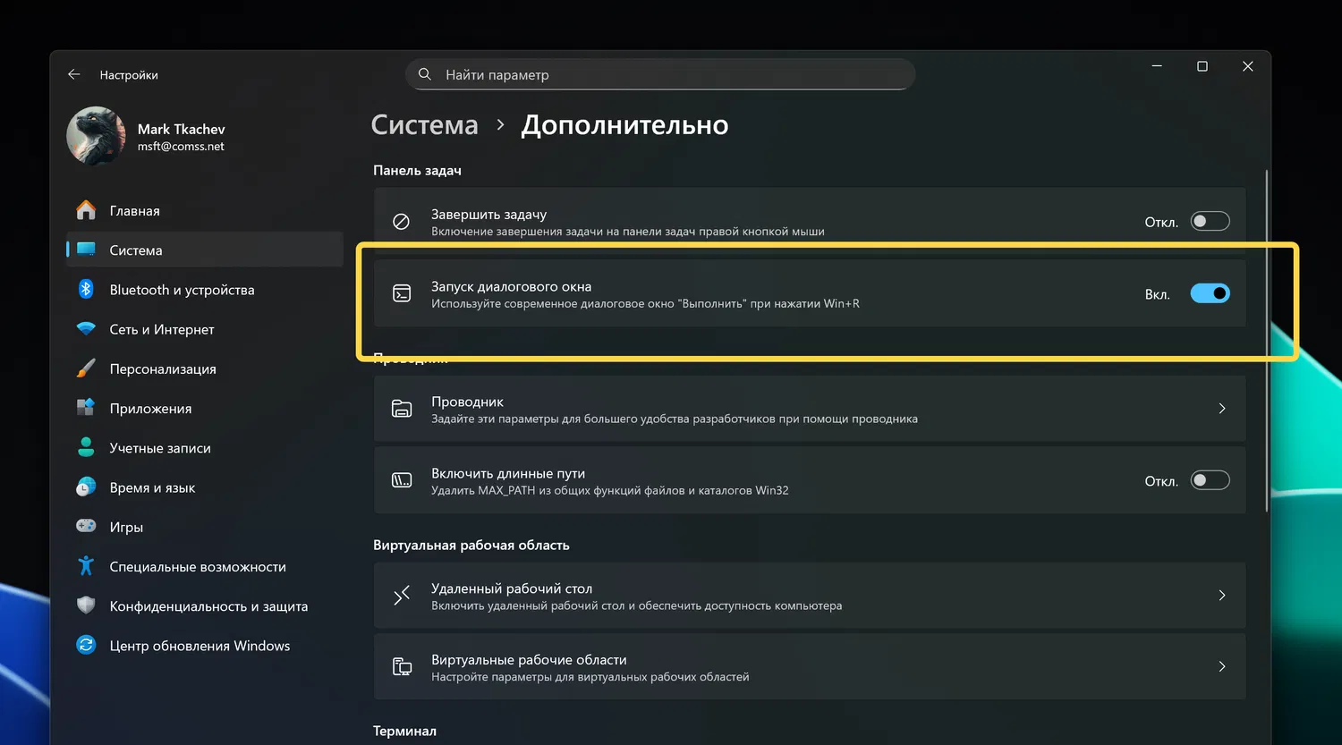 - Перейдите в приложение «Параметры» > Система > Дополнительно и включите переключатель Запуск диалогового окна (Диалоговое окно «Выполнить»).