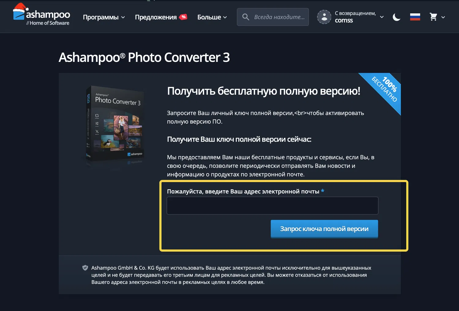 1. Перейдите на страницу промо-акции, введите ваш адрес электронной почты и нажмите кнопку Запрос ключа полной версии.