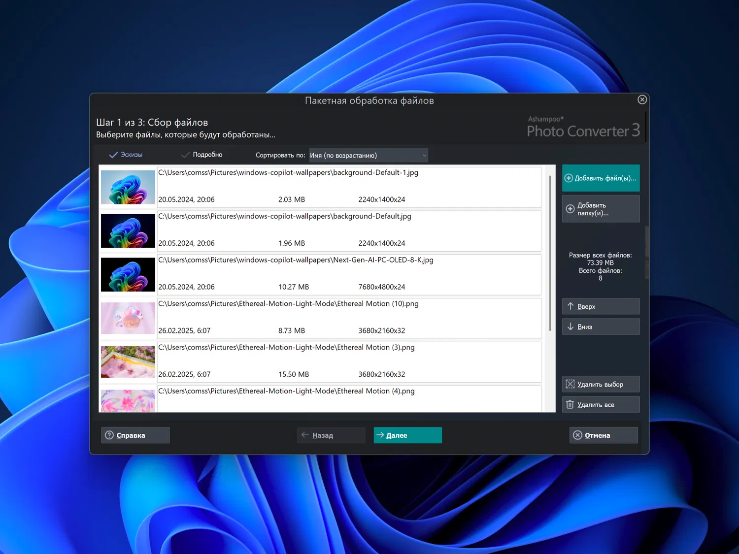 Ключевая особенность — удобная работа с большими наборами файлов за один запуск. Ashampoo Photo Converter 3 поддерживает обработку целых папок, сохранение структуры каталогов и применение одинаковых цепочек действий ко всем изображениям, что особенно полезно при подготовке фотоархивов, контента для сайтов и массовом приведении изображений к единому формату.