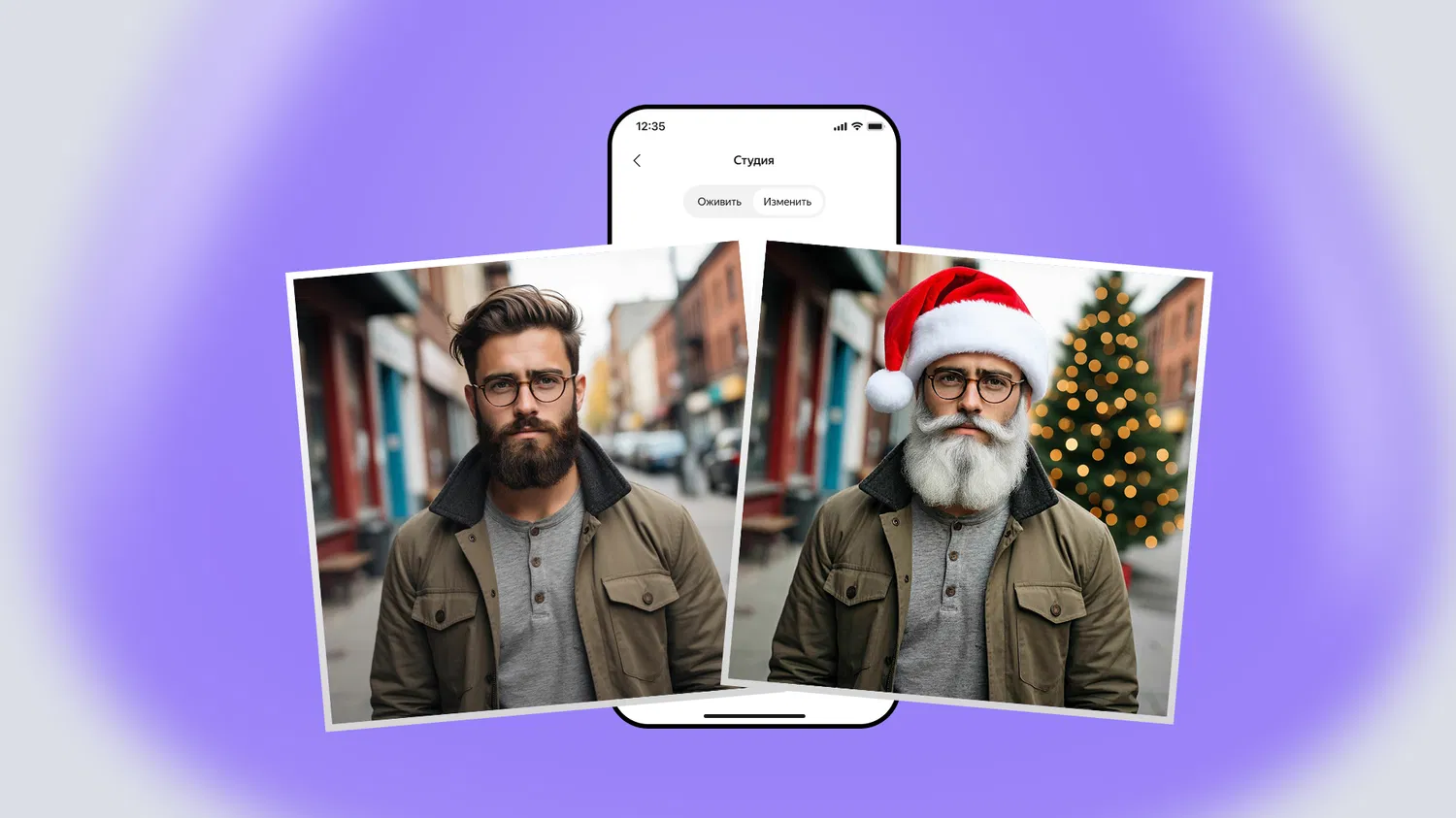 Уже сейчас в режиме редактирования доступны различные шаблоны. Например, можно добавить персонажу чёрный смокинг или вечернее платье. Также представлены новогодние шаблоны, которые позволяют создавать праздничные открытки — для отправки близким или печати к новогодней вечеринке.