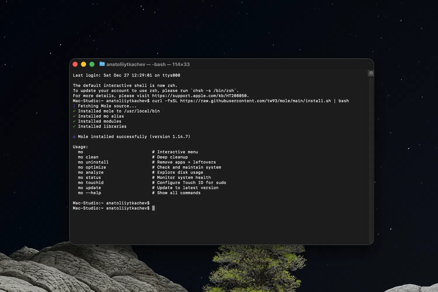 curl -fsSL https://raw.githubusercontent.com/tw93/mole/main/install.sh | bash