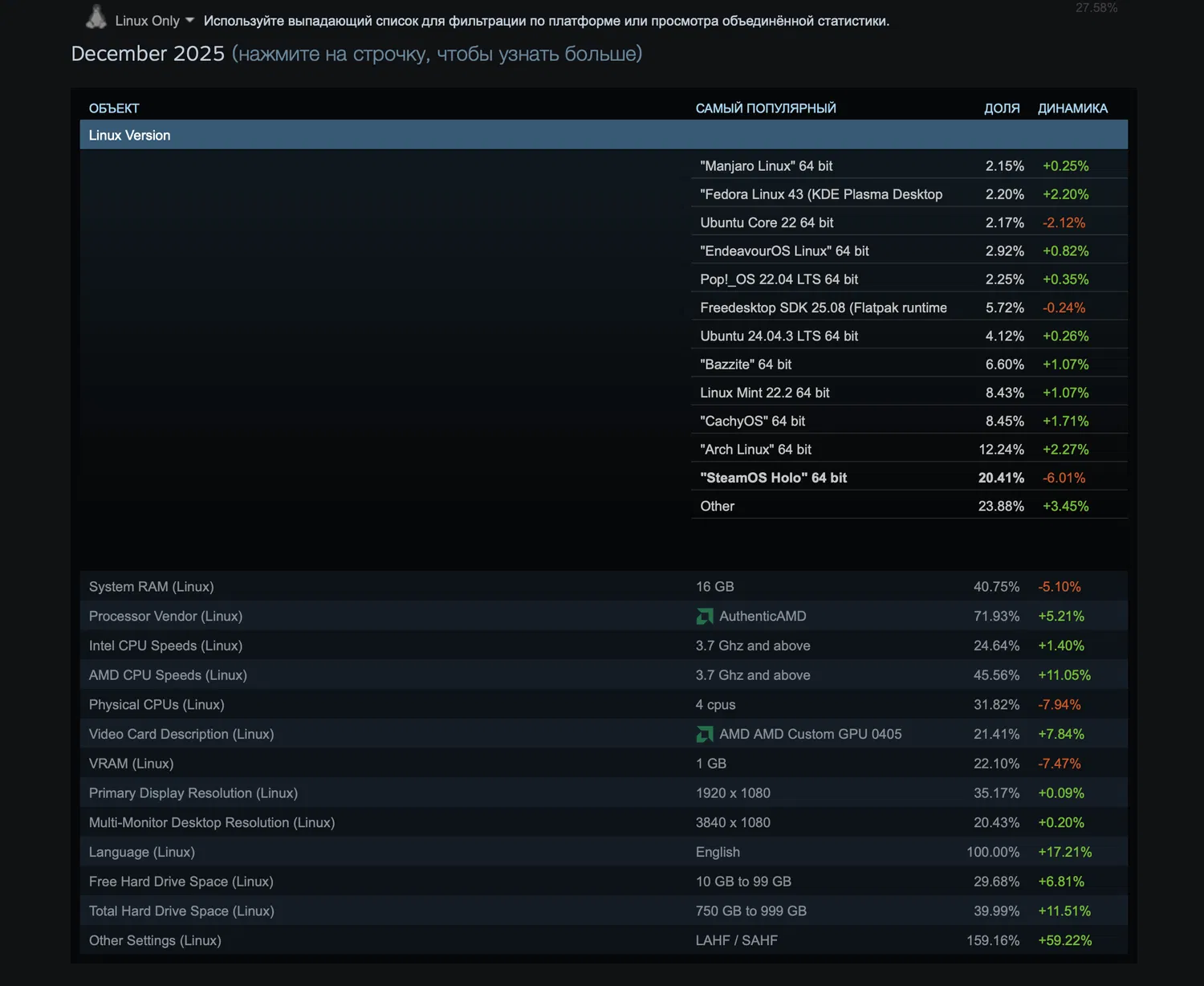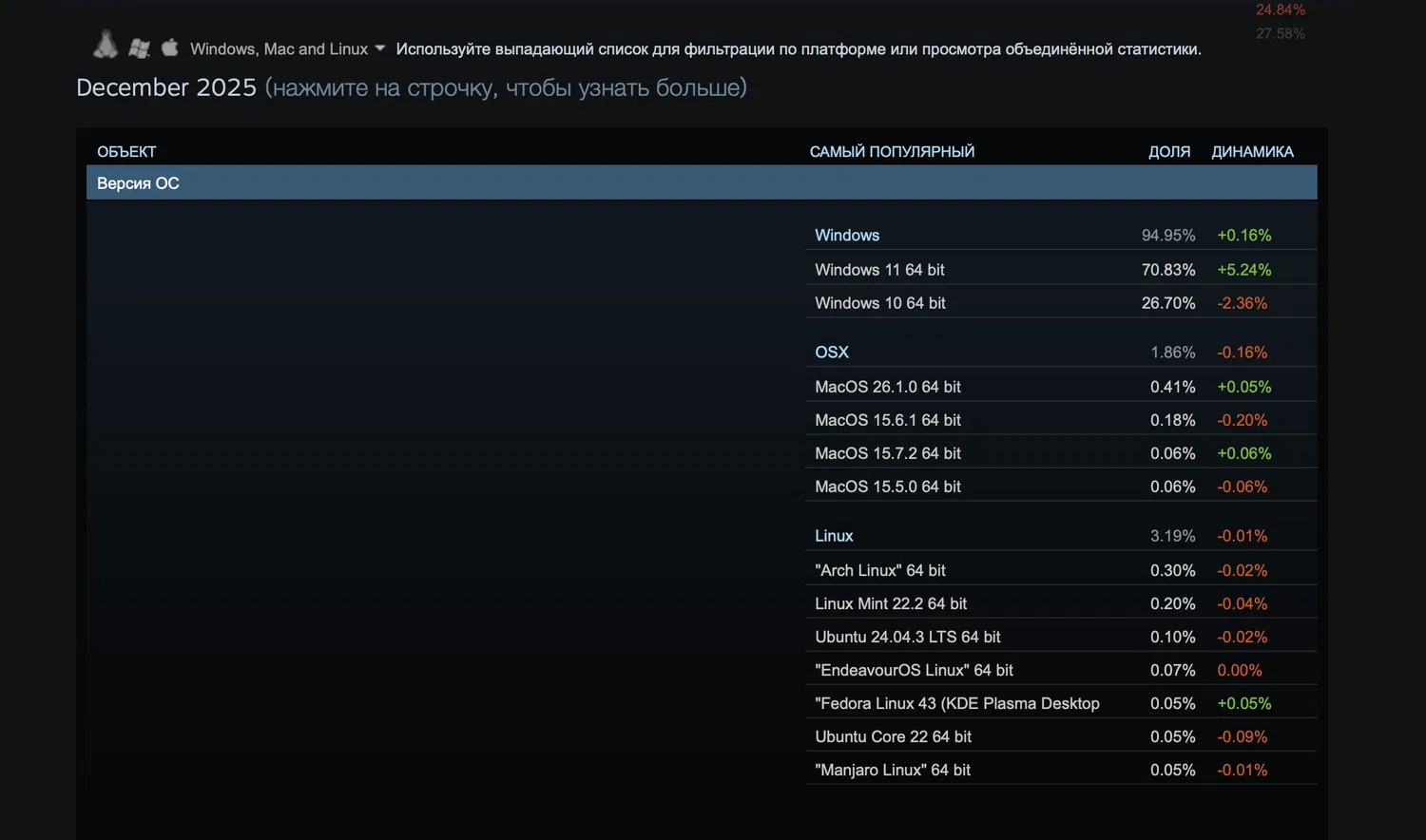 В прошлом году пользователи активно обсуждали окончание поддержки Windows 10, а многие СМИ и разработчики призывали переходить на Linux. Однако, фактический рост доли Linux среди пользователей Steam остаётся умеренным. Согласно новым Данным об оборудовании и ПО пользователей в опросе Steam за декабрь 2025 года , доля Steam на Linux составила 3,19%, что лишь на 0,01% ниже рекордного значения ноября (3,2%).