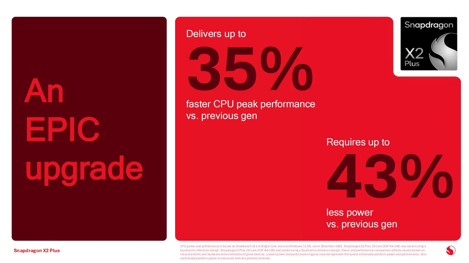 При этом Qualcomm подчёркивает: меньшее количество ядер не означает слабую производительность платформы. По заявлениям компании, X2 Plus способен превосходить конкурирующие энергоэффективные процессоры Intel (включая Lunar Lake и Arrow Lake) как по производительности CPU, так и по энергоэффективности.