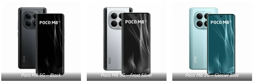 На индийском рынке Poco M8 5G предлагается в трех цветовых решениях: Glacier Blue, Black и Frost Silver. Цены на различные конфигурации памяти распределились следующим образом:
