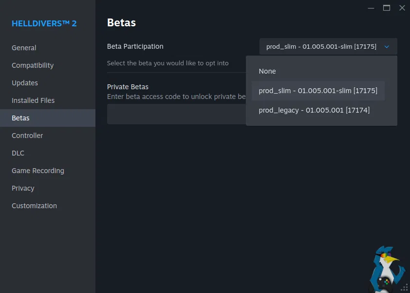 - Выберите опцию Steam Beta Update.