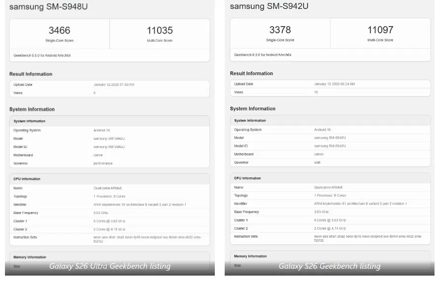 В ходе тестов Galaxy S26 Ultra набрал 3466 баллов в одноядерном и 11 035 баллов в многоядерном режиме. Базовая модель Galaxy S26 показала схожие результаты: 3378 и 11 097 баллов. Оба смартфона оснащены 12 ГБ оперативной памяти и работают под управлением Android 16 с вероятной программной оболочкой One UI 8.5.