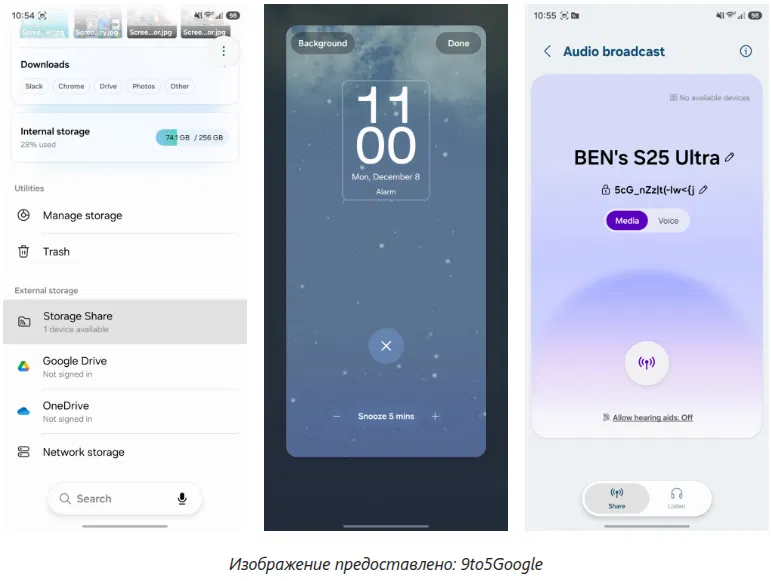 В рамках развития экосистемы представлена функция Storage Share. Она позволяет получать доступ к файлам на других устройствах Galaxy (планшетах или ПК) непосредственно через стандартное приложение Мои файлы. Новая опция Audio Broadcast превращает смартфон в микрофон для трансляции голоса на ближайшие устройства с поддержкой Bluetooth LE Audio через технологию Auracast. Также были улучшены инструменты Smart View и Galaxy DeX.