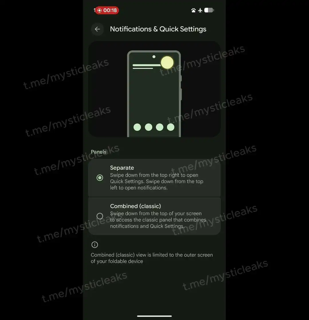 - Режим Combined (classic) сохраняет привычное поведение: свайп вниз от верхней части экрана открывает классическую объединенную панель, где уведомления и быстрые настройки находятся вместе.