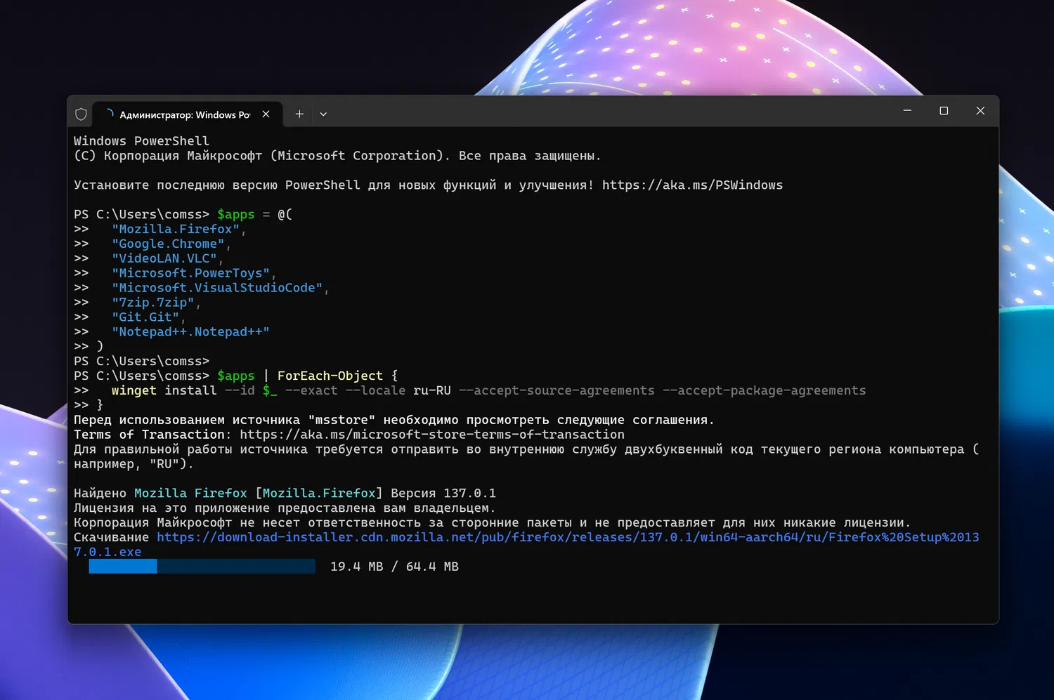 winget install --id $_ --exact --locale ru-RU --accept-source-agreements --accept-package-agreements