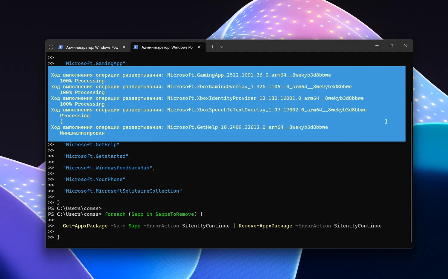 Чтобы удалить приложения из Windows, выполните следующий скрипт в PowerShell, запущенном с правами администратора: