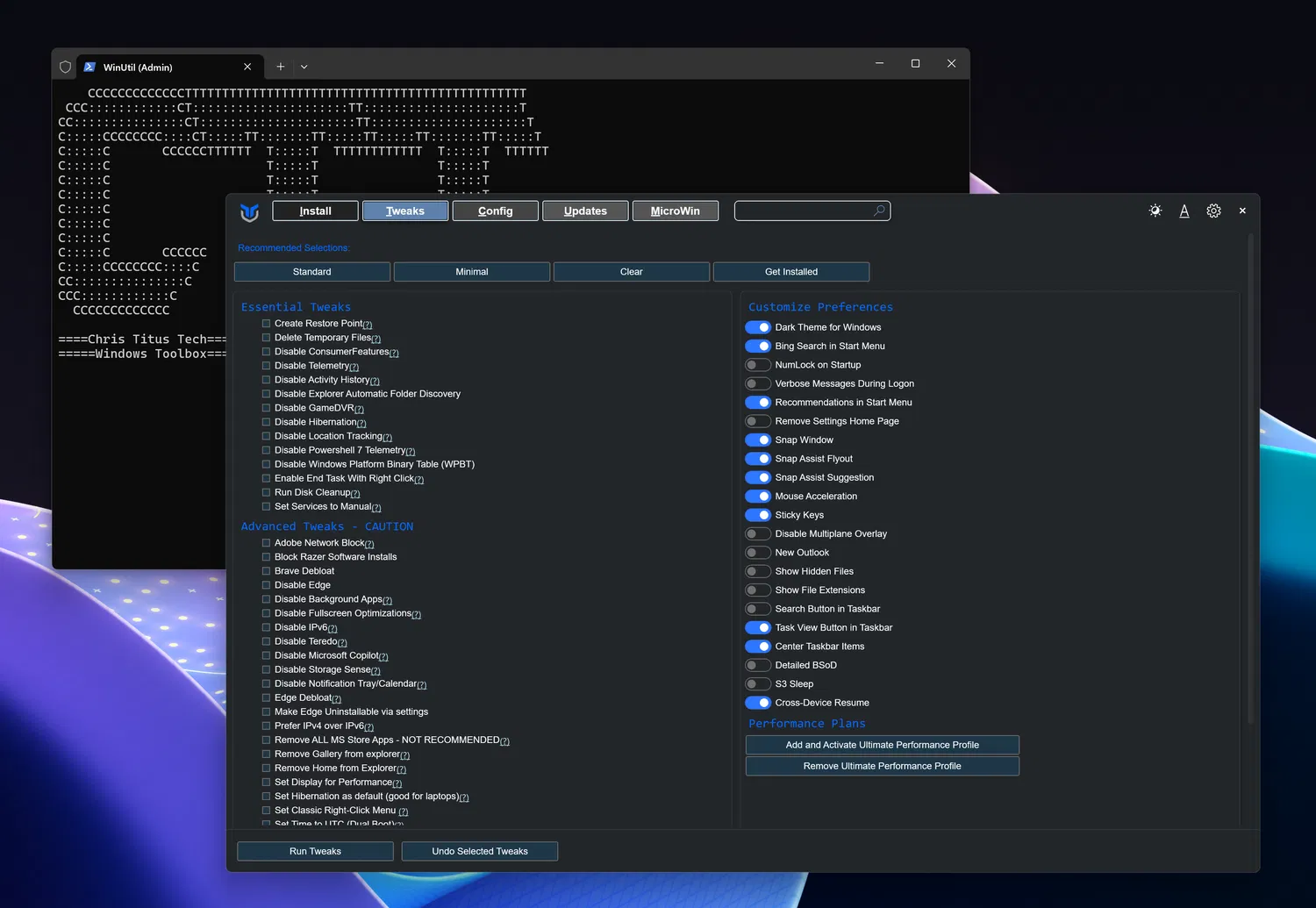 Далее используется утилита, разработанная Chris Titus, предназначенная для настройки большинства системных параметров Windows. Утилита также поддерживает установку приложений через WinGet, однако основной интерес представляет ее функциональность по отключению компонентов системы. Инструмент ориентирован как на опытных пользователей, так и на широкую аудиторию. В нем собраны службы, компоненты и функции Windows, которые наиболее часто отключаются при чистой установке ОС.
