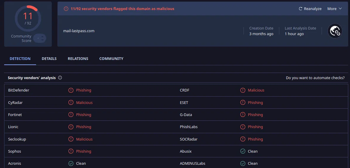 Очевидно, что любое официальное письмо от LastPass должно приходить с домена lastpass.com. Также выявить попытку фишинга можно, проверив адреса ссылок перед нажатием. LastPass поделился списком известных вредоносных доменов, связанных с данной схемой: