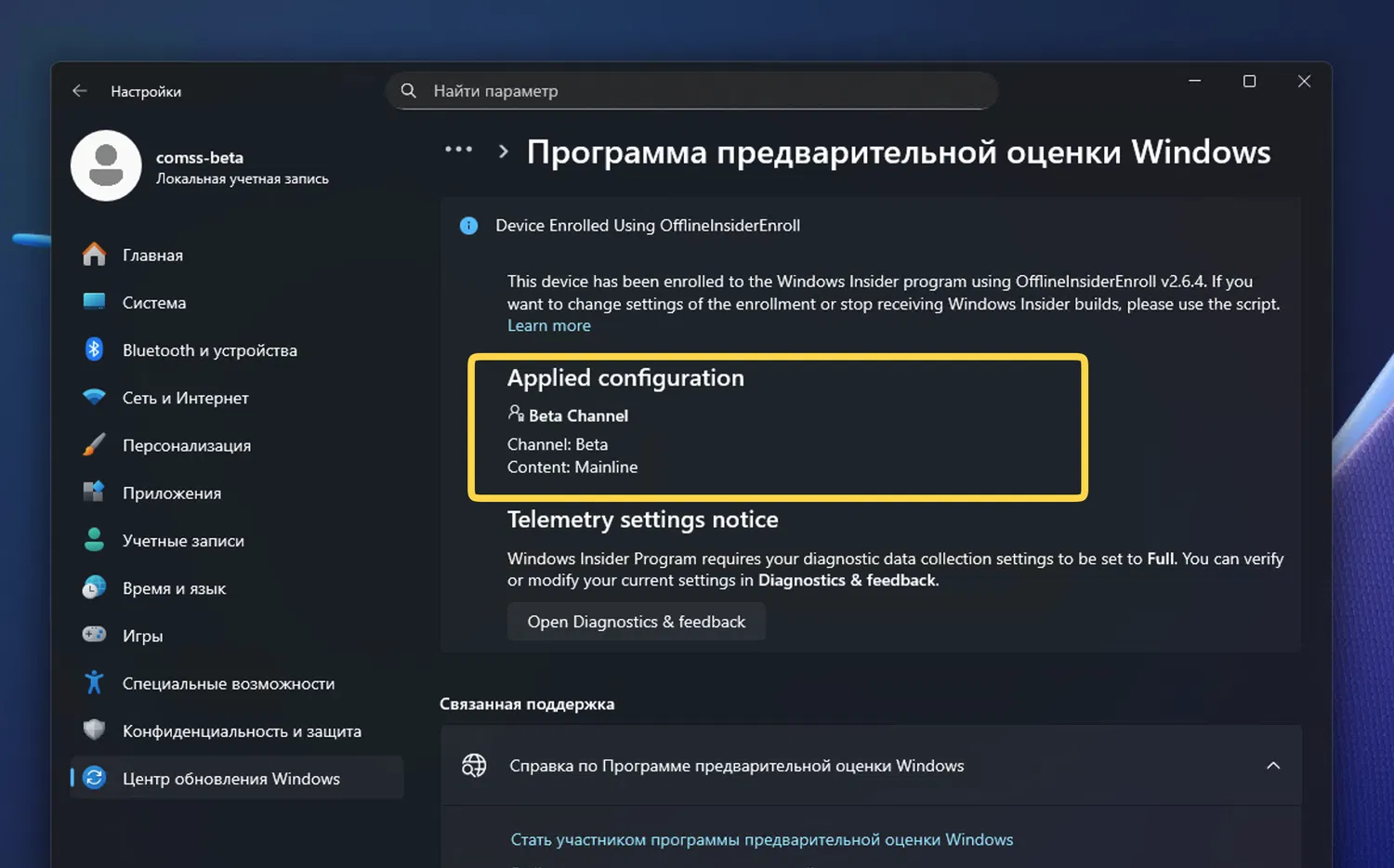 Если вы присоединились к Программе предварительной оценки Windows Insider с помощью OfflineInsiderEnroll и локальной учетной записи Windows 11: