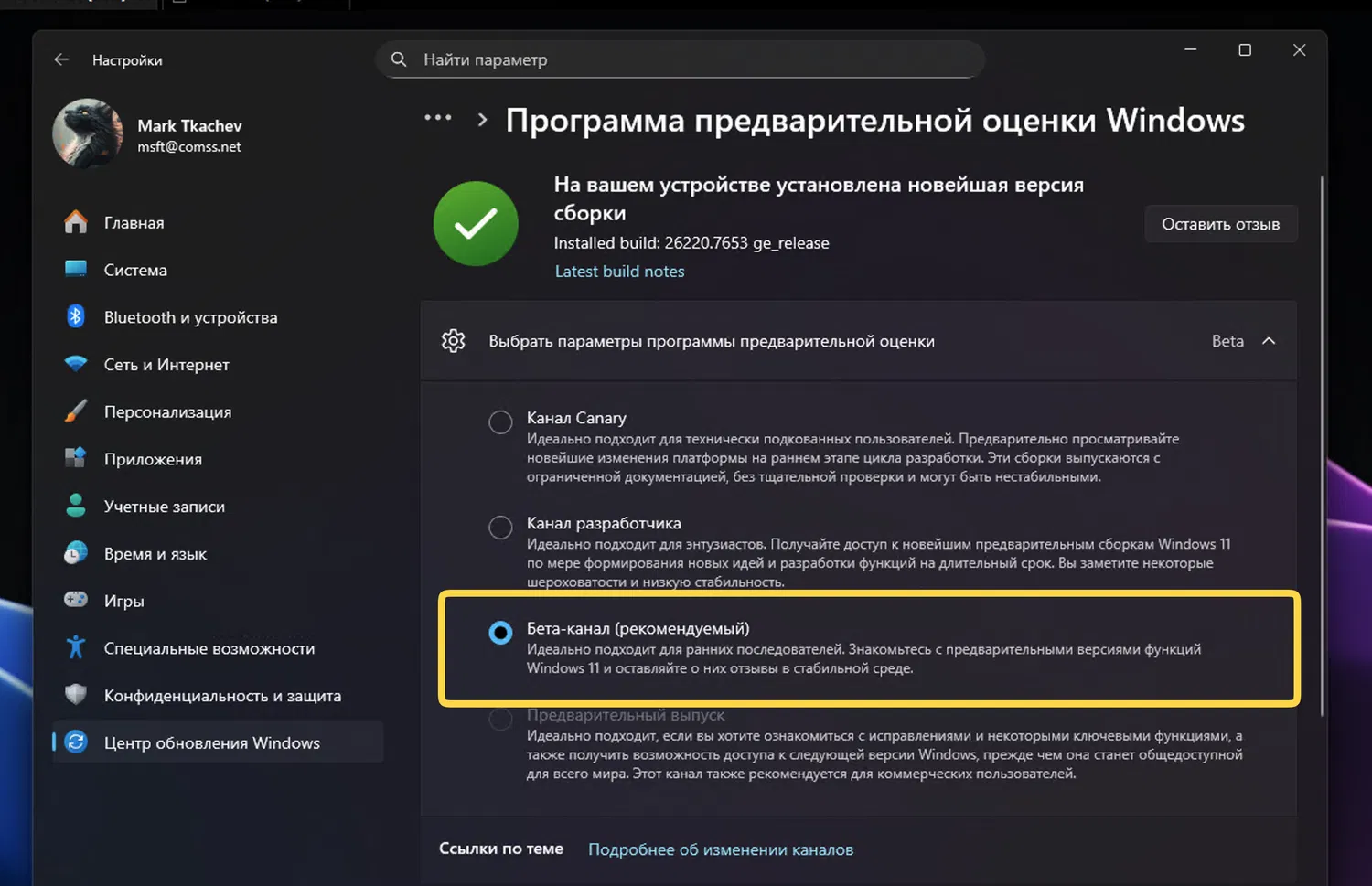 - После этого устройство будет получать дальнейшие сборки уже по каналу Beta. Убедитесь, что перешли на нужный канал в меню Параметры > Центр обновления Windows > Программа предварительной оценки Windows.