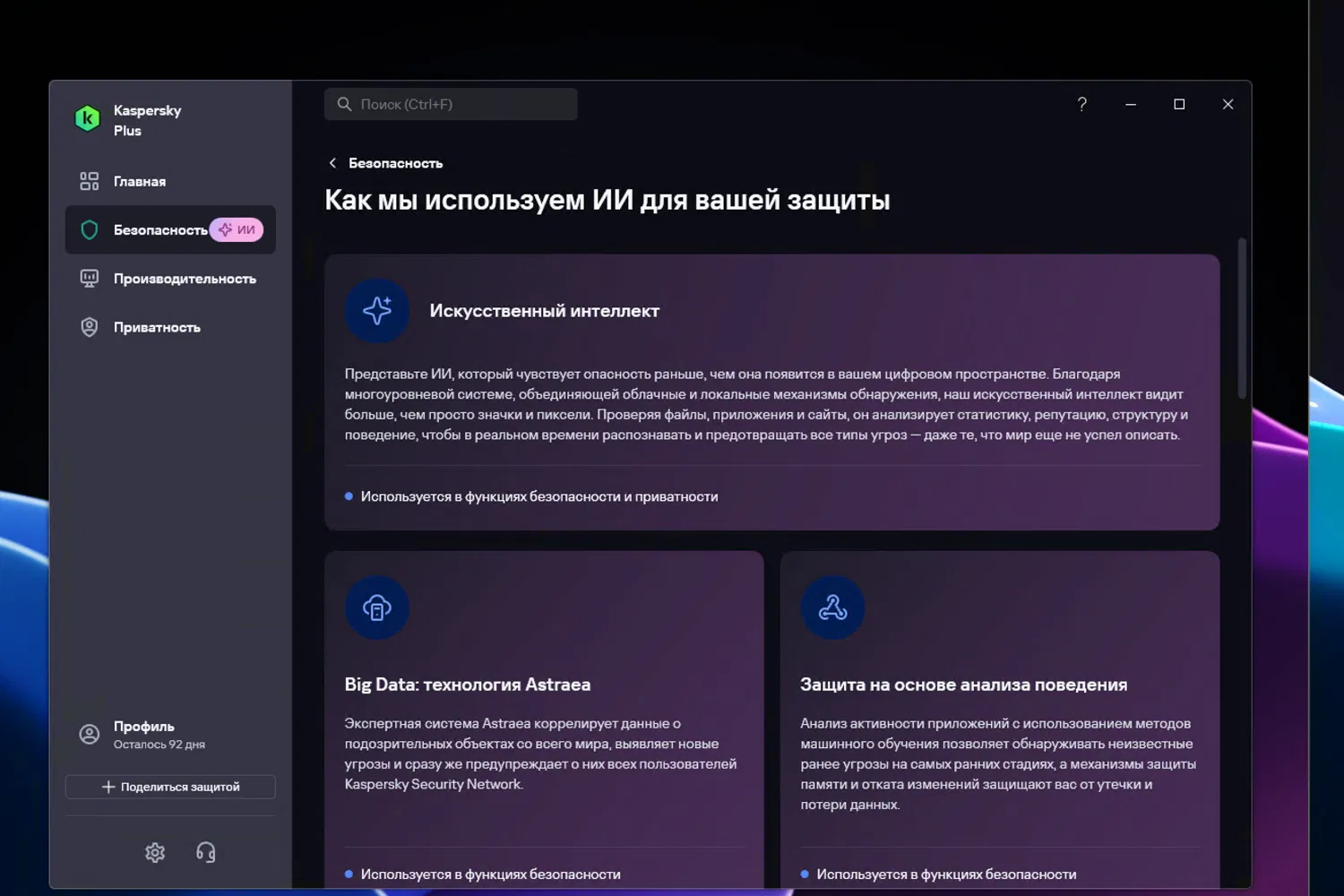 В интерфейсе приложения функции, использующие технологии искусственного интеллекта, отмечаются отдельно. Это позволяет пользователям видеть, какие компоненты защиты опираются на ИИ-механизмы, и лучше понимать, как именно обеспечивается безопасность системы.