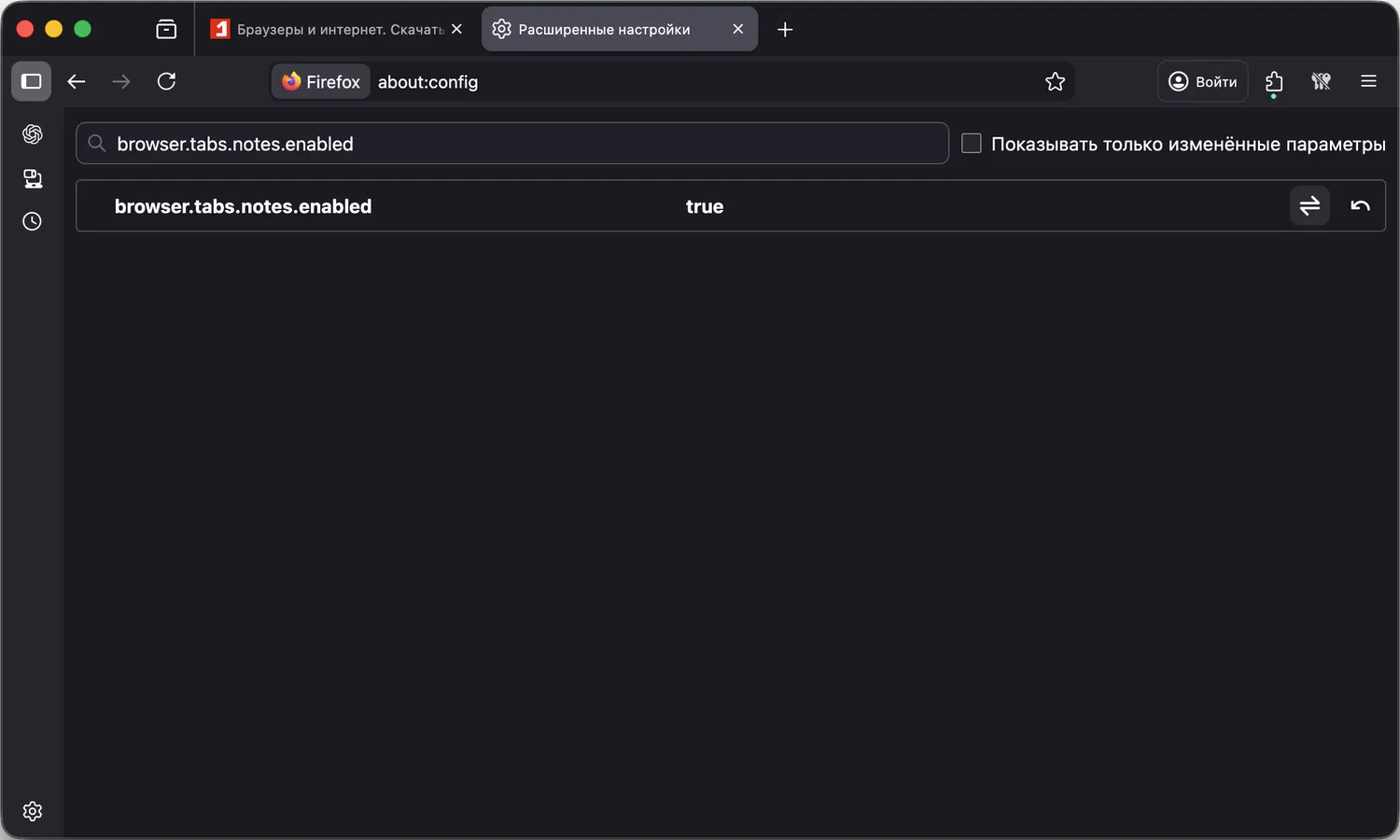 browser.tabs.notes.enabled; - Дважды щёлкните по нему, чтобы установить значение