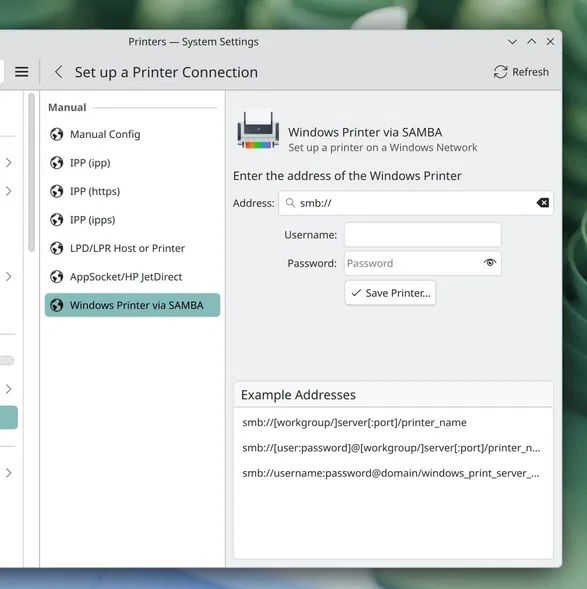 Ключевым дополнением стал новый выделенный интерфейс для настройки общих принтеров в сетях Windows. Данный инструмент упростит интеграцию рабочего окружения в смешанные корпоративные и домашние сети, облегчая процесс подключения печатающих устройств.