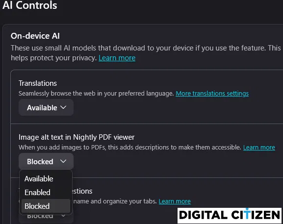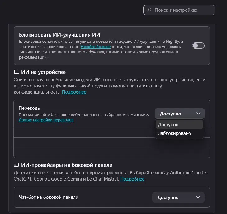 Пока эти настройки доступны не всем пользователям Firefox Nightly. В ходе тестирования подтверждено, что каждую ИИ-функцию можно вручную заблокировать через этот раздел.
