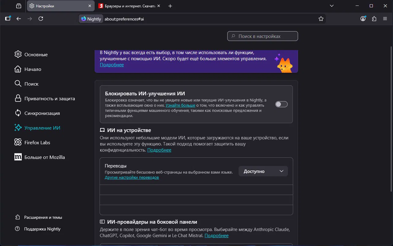 Раздел «Управление ИИ» (AI Controls) в настройках Firefox Nightly позволяет управлять каждой ИИ-функцией отдельно, а не через один общий переключатель. Это дает более наглядное понимание того, где и как ИИ используется в разных областях браузера.