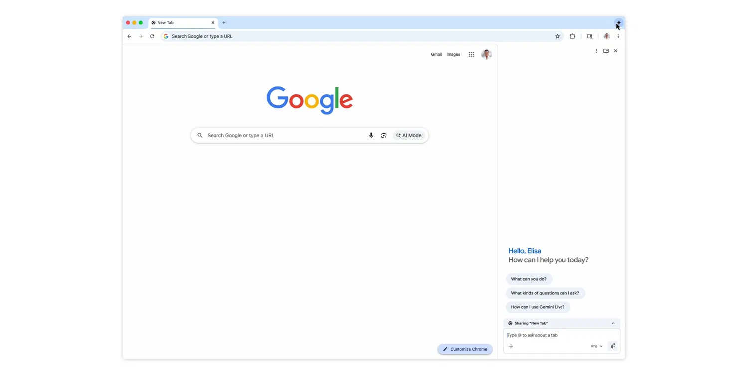 Активная вкладка подсвечивается, а обновленная боковая панель Gemini в реальном времени показывает, какие шаги выполняются.