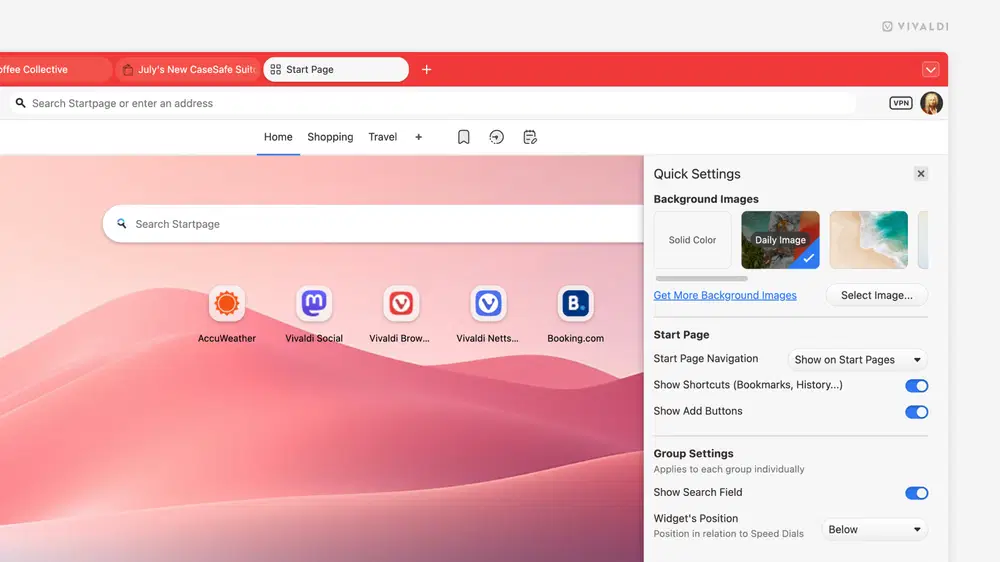 В Vivladi 7.8 добавлена опция Daily Image (Ежедневное изображение) для стартовой страницы. При включении фон будет автоматически меняться каждый день, используя изображения с Unsplash. Функция полностью опциональна.