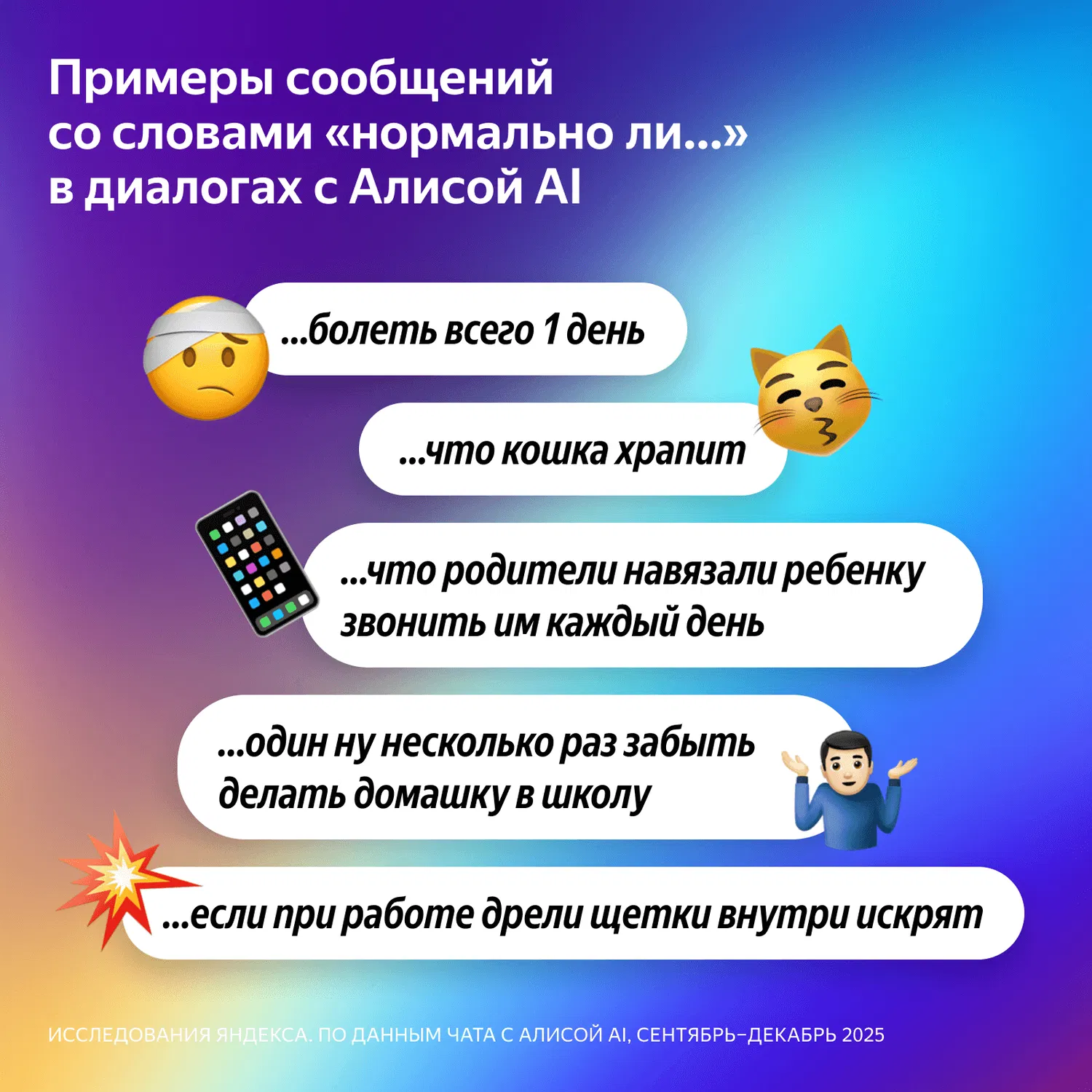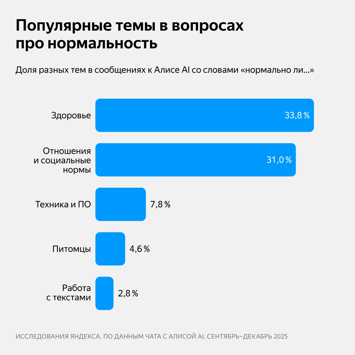 Аналитики Яндекса изучили запросы к Алисе AI со словами «нормально ли…» и выяснили, что больше всего волнует пользователей. Оказалось, что чаще всего люди переживают из-за здоровья — этой теме посвящена примерно треть таких сообщений. Почти столько же вопросов связано с эмоциями, социальными нормами и отношениями. На третьем месте — техника и ПО.