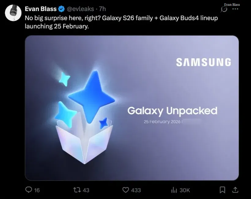 Известный инсайдер Evan Blass опубликовал изображение, внешне полностью соответствующее официальным промоматериалам Samsung. На постере указана дата проведения Galaxy Unpacked - 25 февраля. На этом мероприятии компания, как ожидается, представит смартфоны серии Galaxy S26, а также новую линейку беспроводных наушников Galaxy Buds 4.