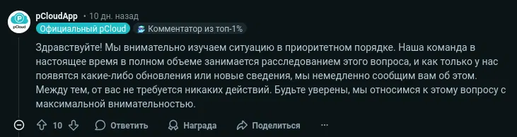 Отдельно подчёркивается, что служба поддержки pCloud, по отзывам комментаторов, ограничивается формальными ответами без конкретных сроков исправления. Часть пользователей заявила, что временно прекратила использование сервиса из-за потери доверия.