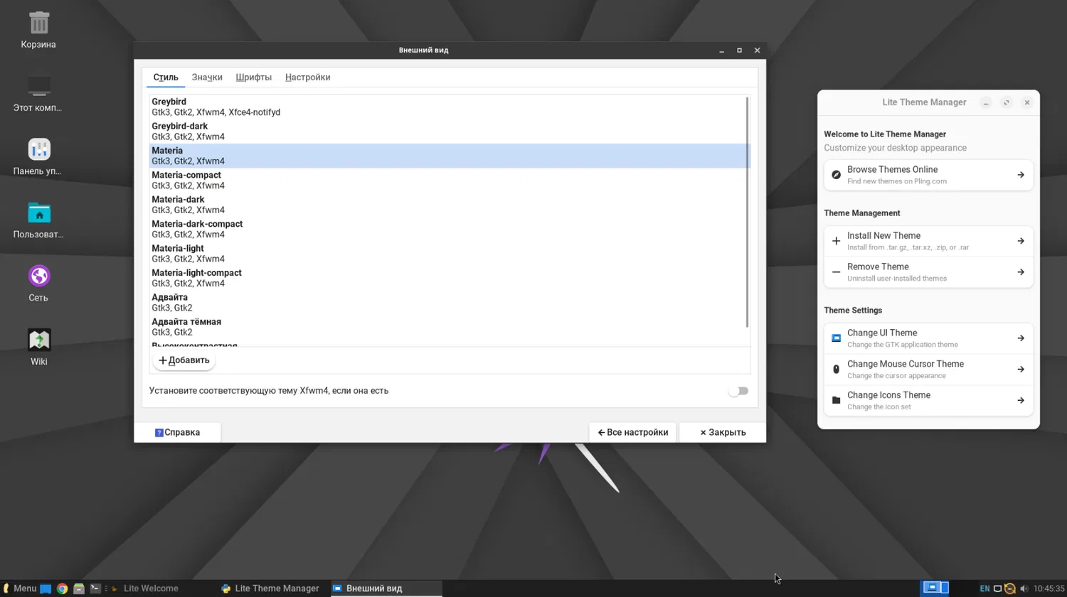 В качестве визуальной основы дистрибутив использует тему окон Materia, набор иконок Papirus и шрифт Roboto Regular.