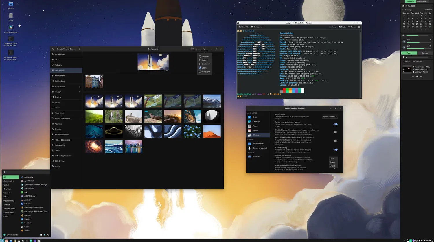 Изменена логика масштабирования фоновых изображений. В Budgie 10.10 использовался принудительный режим заполнения (fill) через swaybg. В новой версии система проверяет предпочтительный стиль размещения из GnomeBG и сопоставляет его с режимами swaybg. Параметр стал настраиваемым через панель «Фон» в центре управления Budgie.