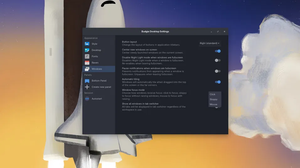 В ветке Budgie 10.9.x, работавшей на базе Mutter (Magpie), поддерживались только режимы «фокус по клику» и «мышь». Переход на композитор labwc в версии 10.10 позволил реализовать поддержку «небрежного» (sloppy) фокуса. Новые настройки интегрированы в параметры рабочего стола Budgie и мост labwc, предлагая пользователям три варианта поведения окон: