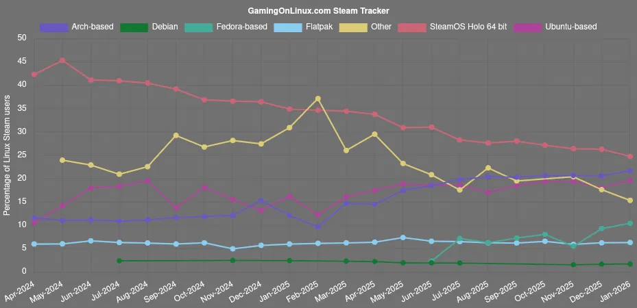 В январе 2026 года среди пользователей Steam на Linux наиболее распространёнными дистрибутивами оказались: