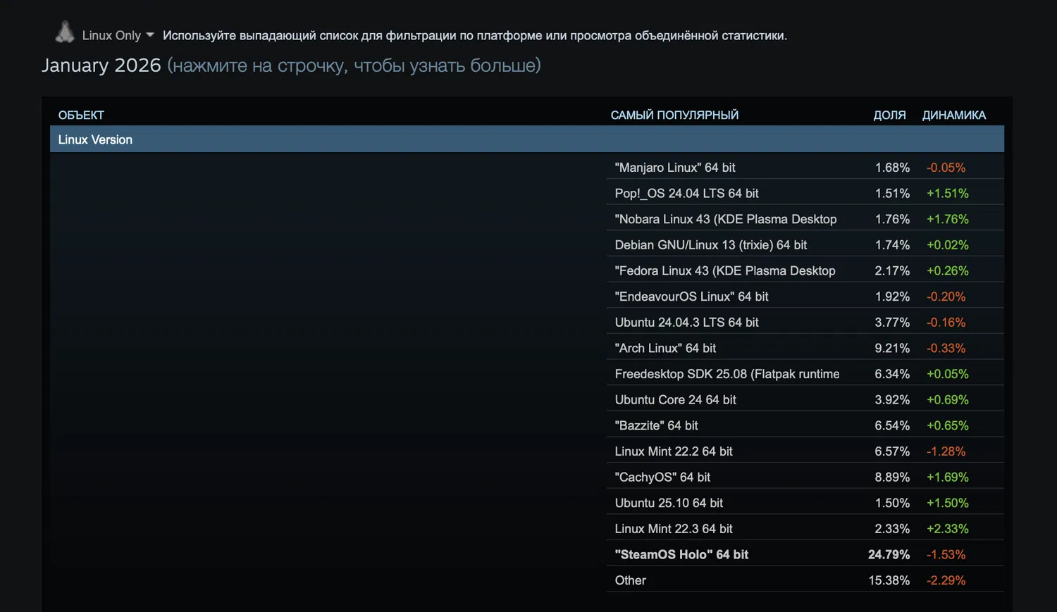 Примечательно, что в статистике впервые появилась Nobara Linux 43 (KDE Plasma Desktop Edition), которая ранее не фигурировала в отчётах Steam в заметной доле.