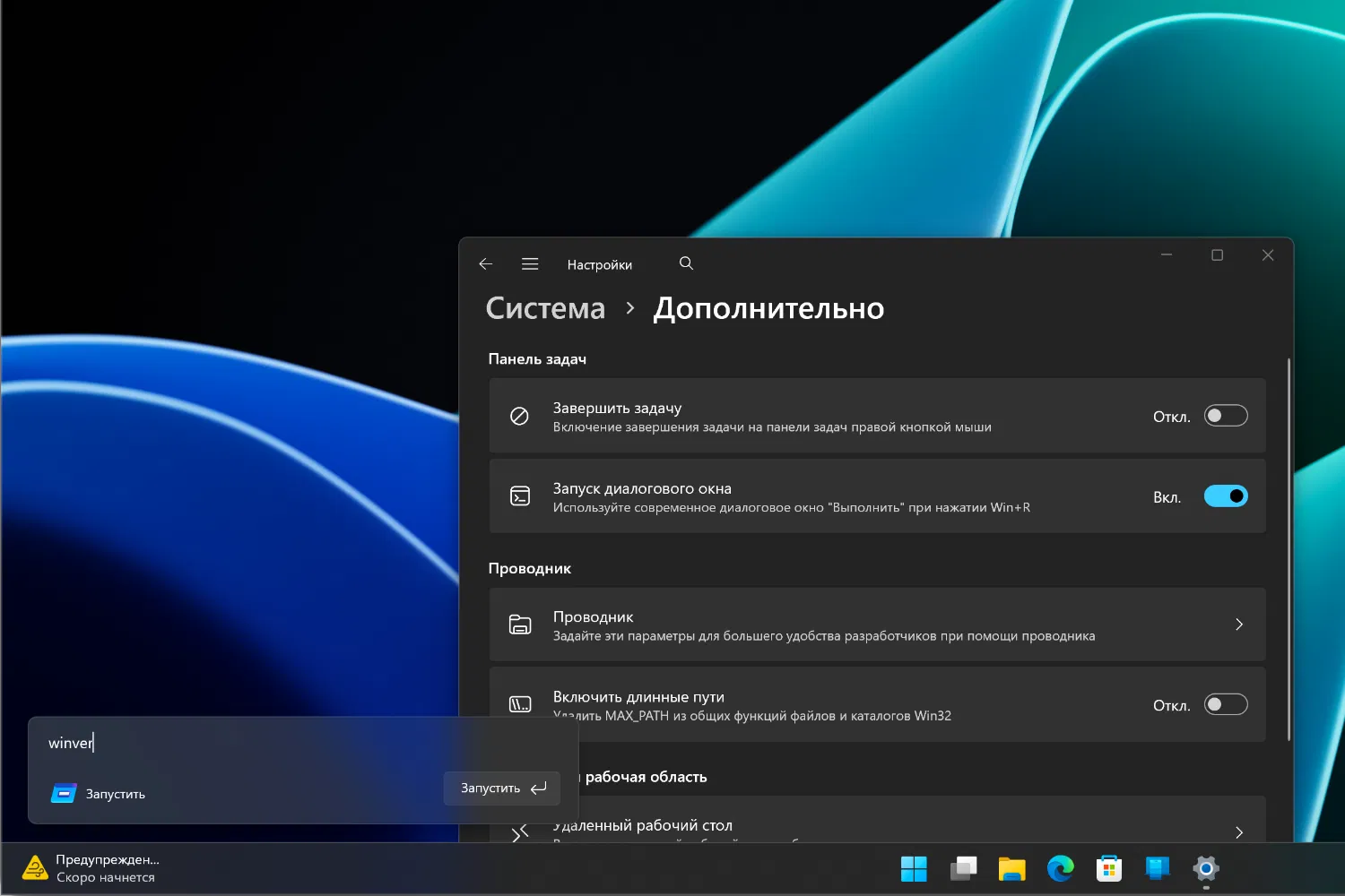 В Windows 11 также тестируется новая современная версия окна «Выполнить», которая может заменить классический Run при ручном включении параметра Modern Run в разделе Параметры > Система > Дополнительно.