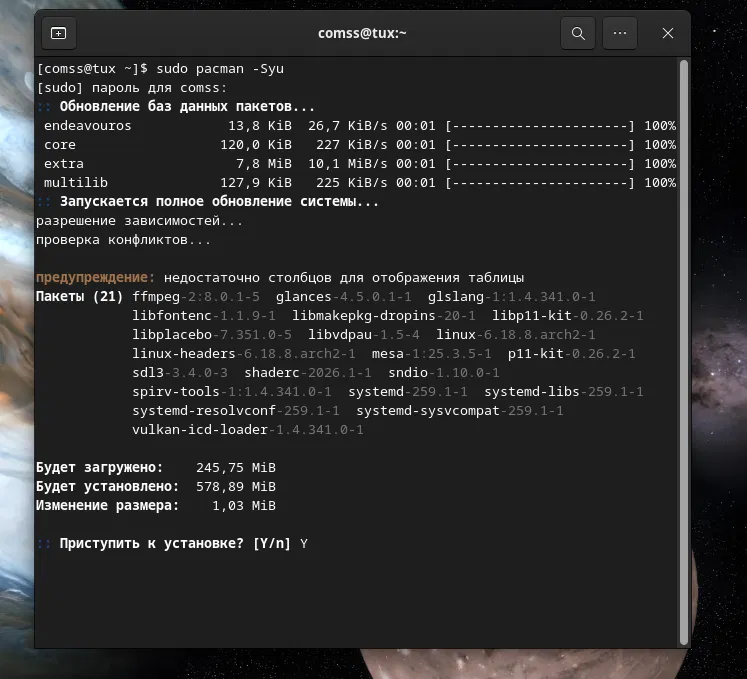 Синтаксис pacman отличается лаконичностью. Для полного обновления системы используется команда sudo pacman -Syu, в то время как в Ubuntu аналогичная процедура требует ввода sudo apt update && sudo apt upgrade.