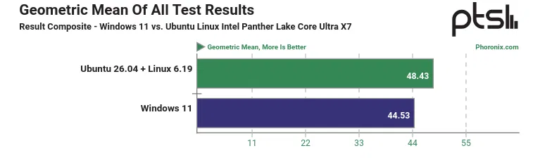 Ресурсом Phoronix проведено сравнение производительности процессора Intel Core Ultra X7 358H ("Panther Lake") при работе под управлением операционных систем Microsoft Windows 11 и разрабатываемой версии Ubuntu 26.04. Основной целью тестирования стала проверка эффективности планировщика задач на ядрах разного типа (P, E и LPE) в среде Linux по сравнению с конкурентным решением от Microsoft.