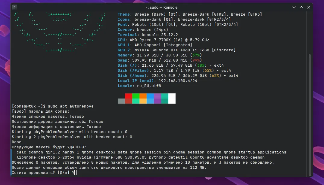 Система запросит подтверждение удаления списка пакетов. Рекомендуется проверить этот список, чтобы убедиться в отсутствии важных приложений. Если список корректен, нажатие Enter освободит пространство на накопителе.